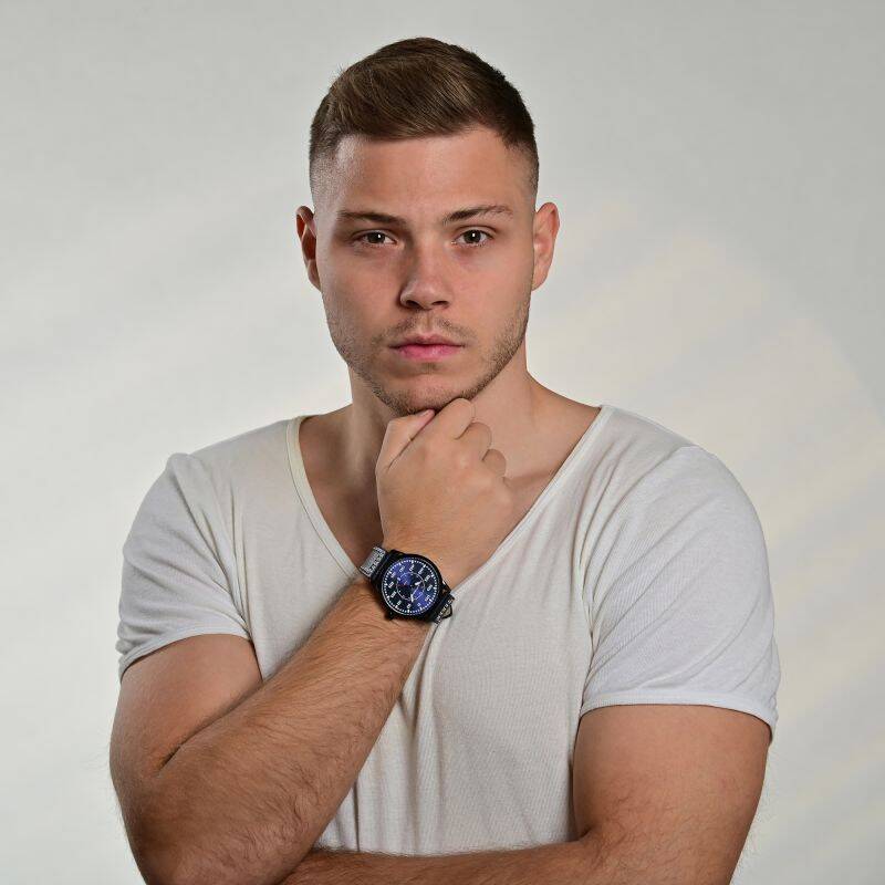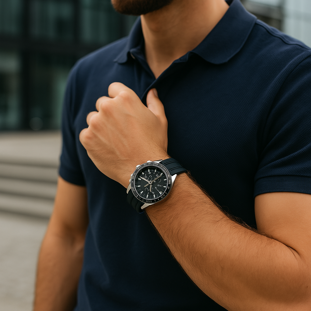 👉 Am besten: eine markante Uhr in Schwarz oder mit dunklem Zifferblatt, robust und charakterstark.