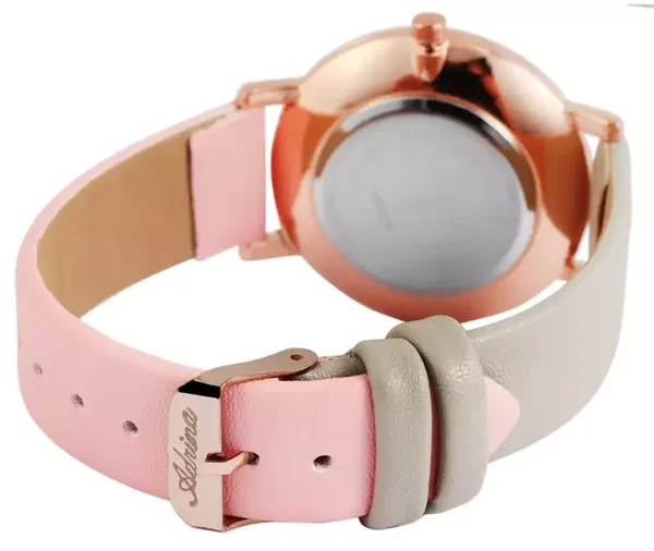 Die Adrina Damen Uhr mit Lederimitationsarmband ist ein modisches Statement, das Zuverlässigkeit und Eleganz perfekt vereint – ein unverzichtbares Accessoire für Frauen, die das Besondere suchen.