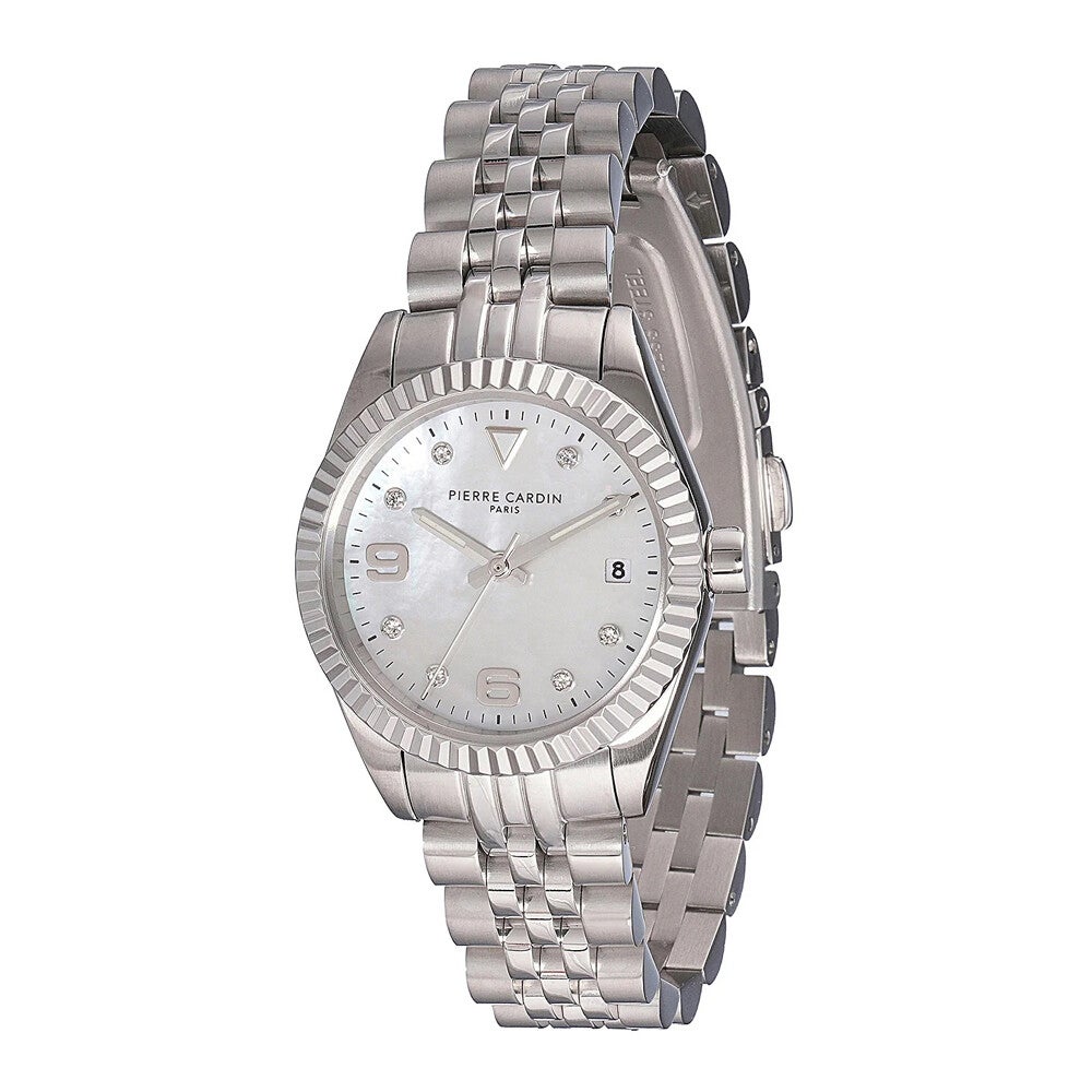 Die Pierre Cardin Opera Timbre Damenuhr besticht durch ihr silberfarbenes Edelstahlgehäuse mit polierter und mattierter Oberfläche. Das mit Steinen besetzte Zifferblatt in Weiß Perlmutt verleiht der Uhr eine luxuriöse Ausstrahlung. Ein stilvolles Accessoire für Damen, die Wert auf zeitlose Eleganz legen.