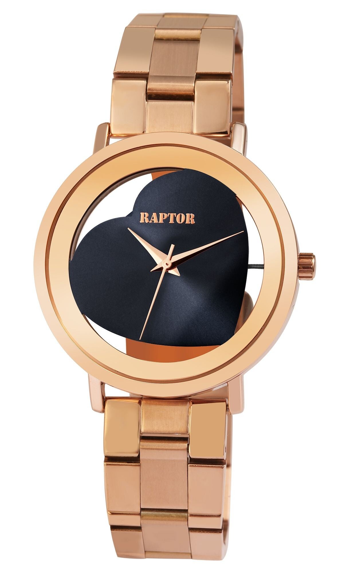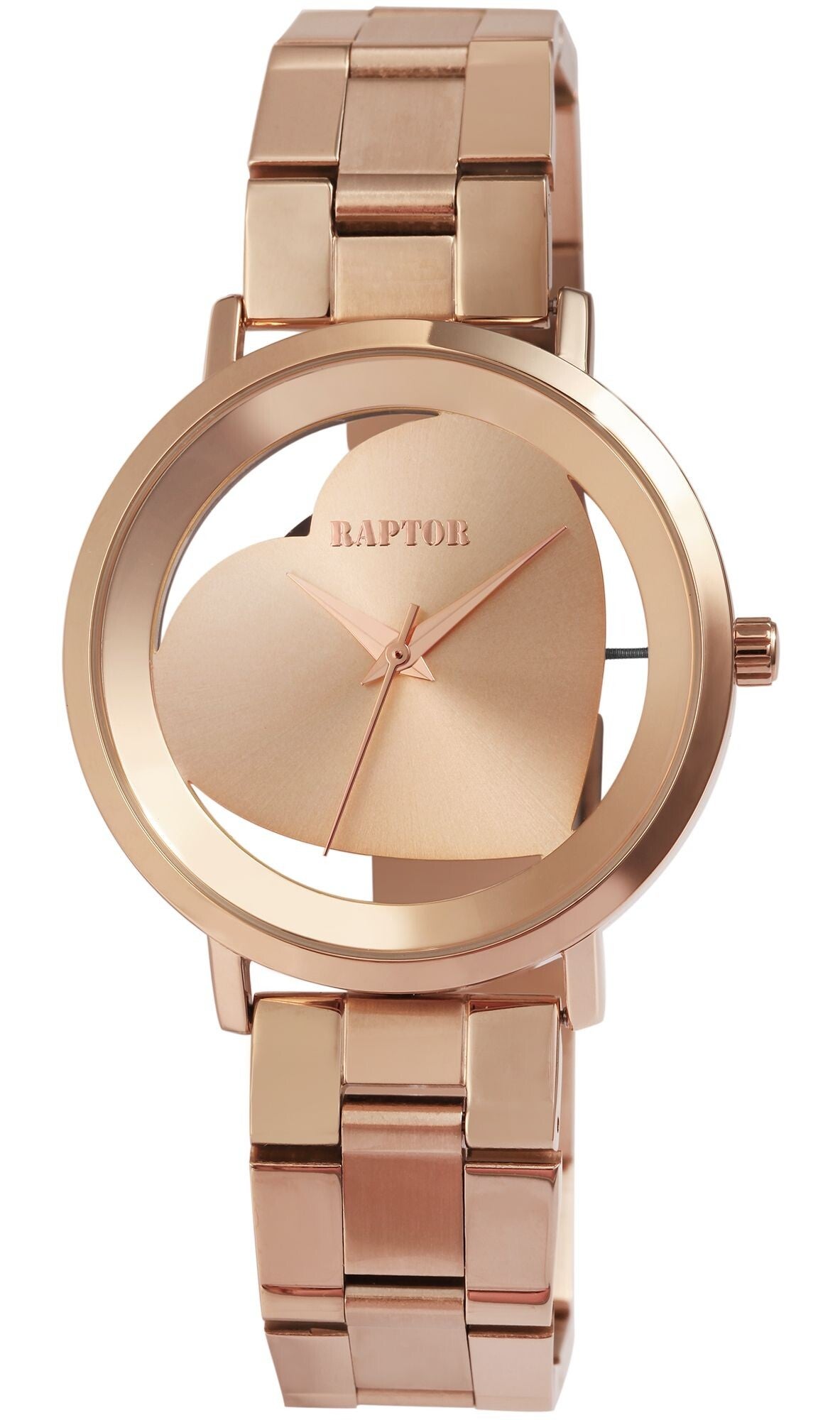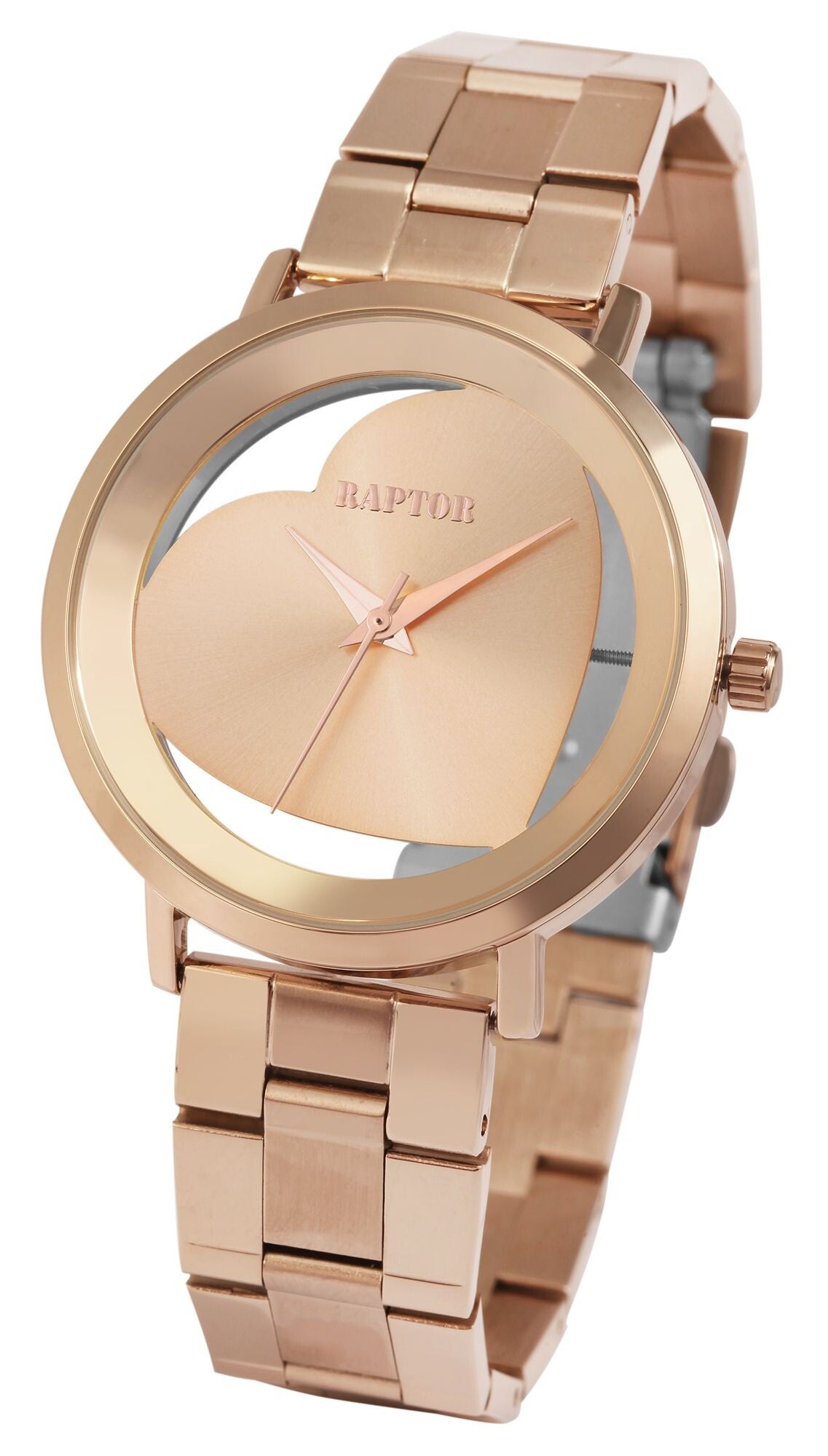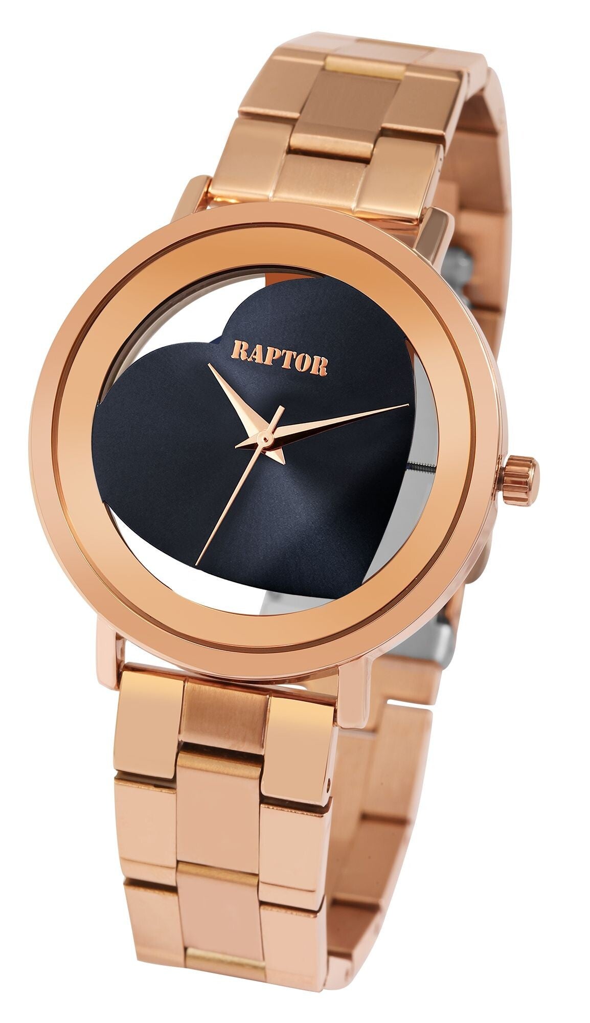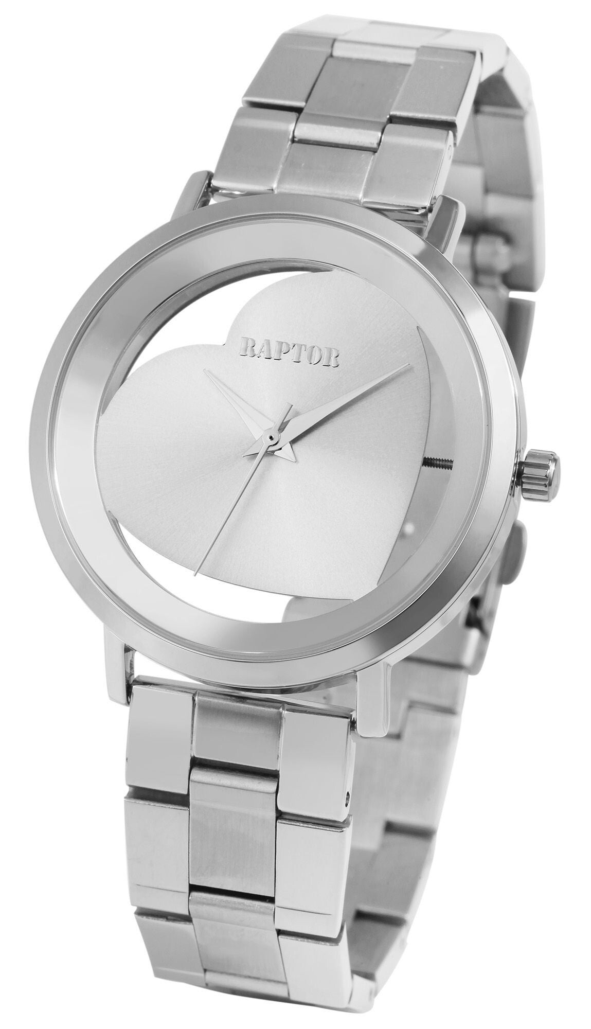 Die Raptor Damenuhr "Hanna" kombiniert elegantes Design mit einem außergewöhnlichen Highlight: Ein durchsichtiges Gehäuseboden-Element mit einem kunstvoll inszenierten Herzmotiv macht diese Uhr zu einem echten Hingucker. Das stilvolle Gliederarmband aus Edelstahl und die harmonisch abgestimmten Zeiger ergänzen den femininen Look auf raffinierte Weise.