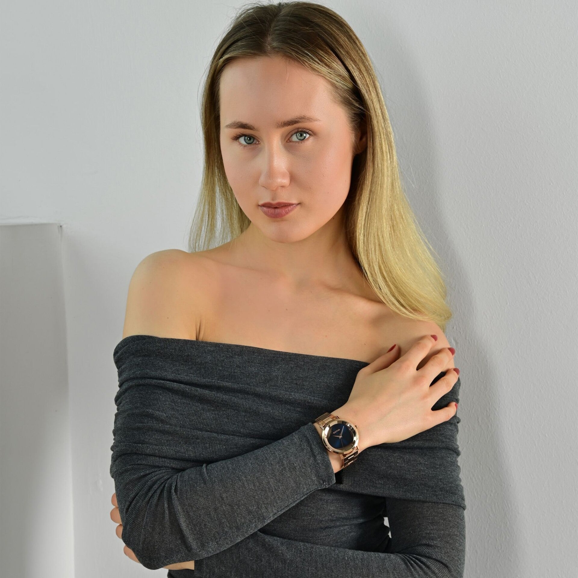 Das runde Metallgehäuse ist mit robustem Mineralglas ausgestattet und misst 38,5 mm im Durchmesser bei einer Höhe von nur 9 mm – perfekt proportioniert für ein stilvolles Damenhandgelenk. Im Inneren sorgt ein zuverlässiges Miyota 2035 Quarzwerk für präzise Zeitmessung.