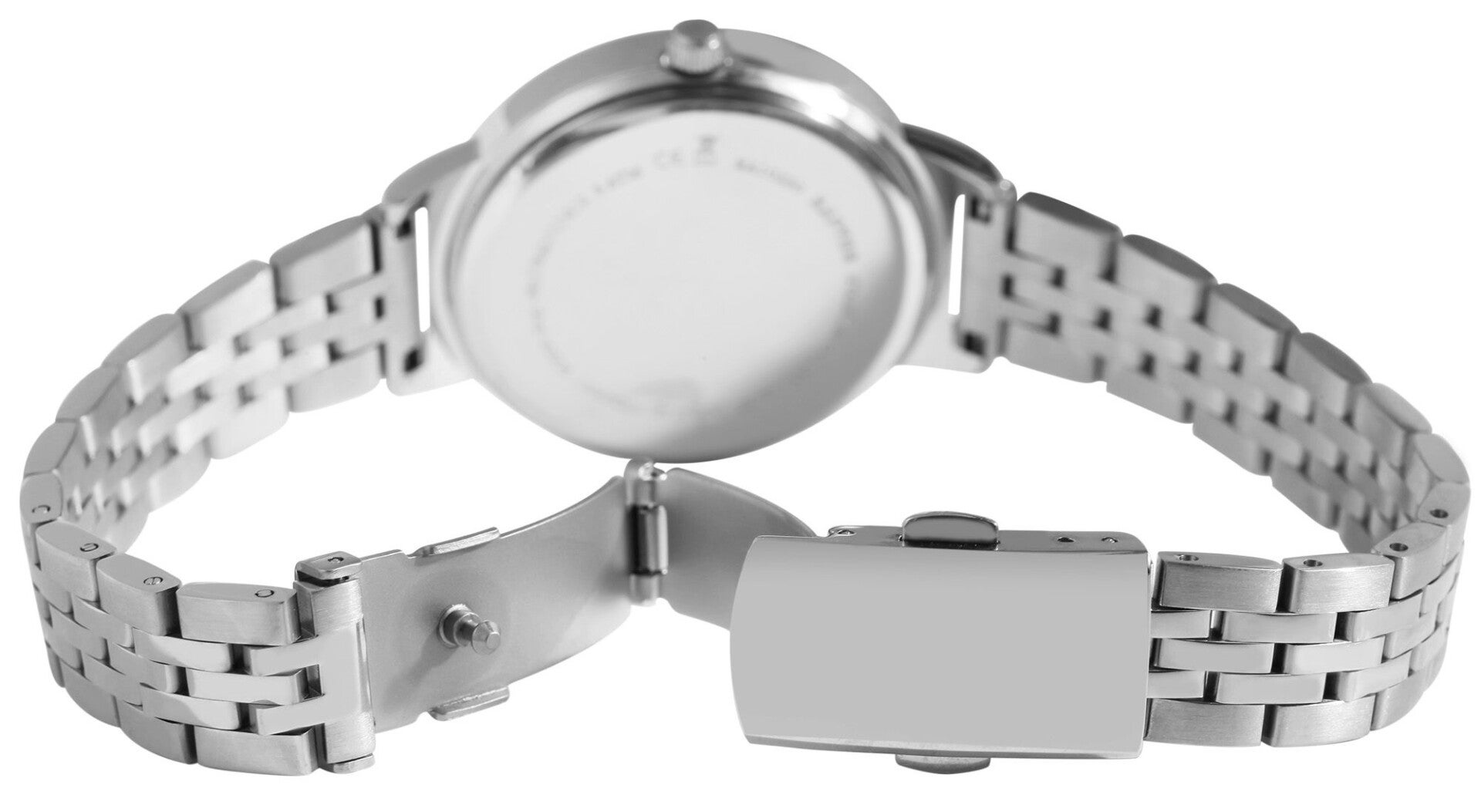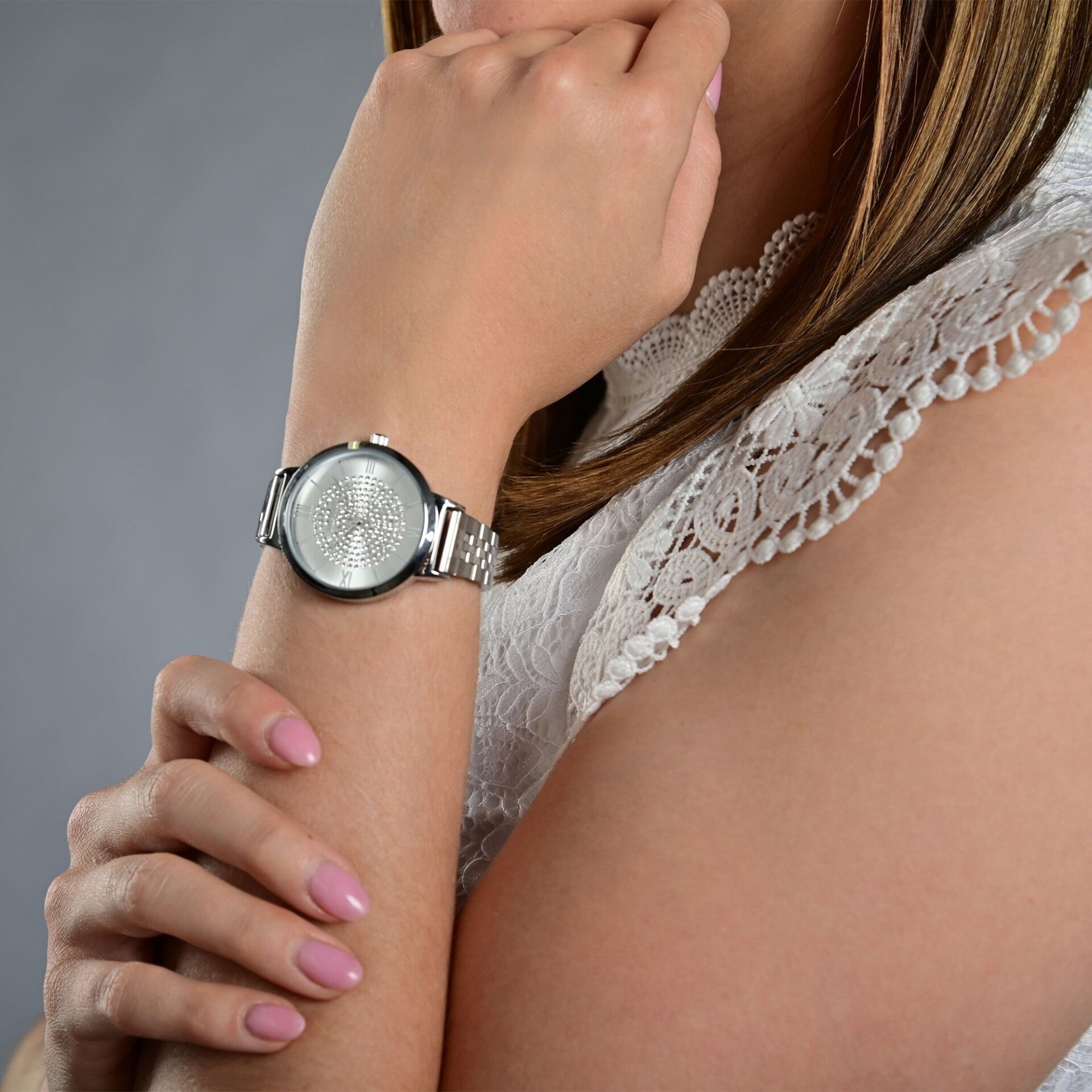 Im Inneren sorgt ein präzises Miyota 2035 Quarzwerk für zuverlässige Zeitangabe. Das runde Metallgehäuse mit einem Durchmesser von 36 mm und einer Höhe von 9 mm wird durch robustes Mineralglas geschützt und überzeugt mit klarer Linienführung. Das übersichtliche Zifferblatt in Creme oder Silber begeistert durch einen mit Similisteinen besetzten Innenring, der der Uhr eine elegante, funkelnde Note verleiht.