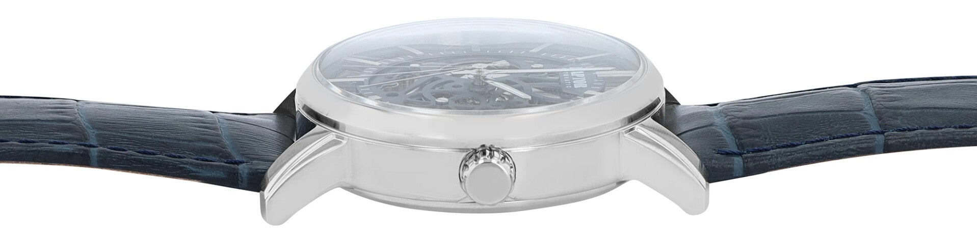 Abgerundet wird der stilvolle Auftritt durch ein hochwertiges Echtlederarmband in Krokodillederoptik. Der Butterfly-Verschluss aus Edelstahl bietet sicheren Halt und feine Justierbarkeit – elegant und praktisch zugleich.