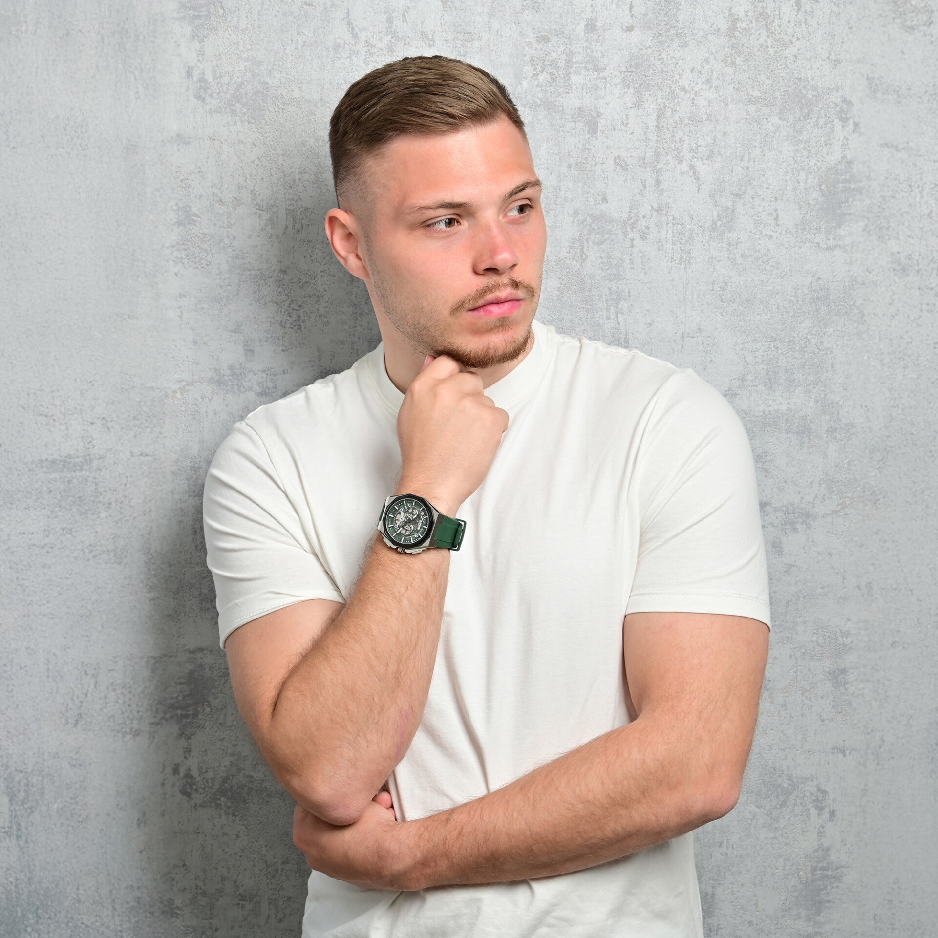 Das 47 mm große Edelstahlgehäuse mit einer Höhe von 14 mm ist robust, stilvoll matt-poliert und bis zu 5 ATM wasserdicht – perfekt für aktive Männer. Das Silikonarmband mit einer Bandbreite von 27 mm sorgt für flexiblen Tragekomfort und sportliche Leichtigkeit. Die Gesamtlänge von 24 cm macht die Uhr ideal tragbar am männlichen Handgelenk – gehalten durch eine stabile Dornschließe aus Edelstahl.
