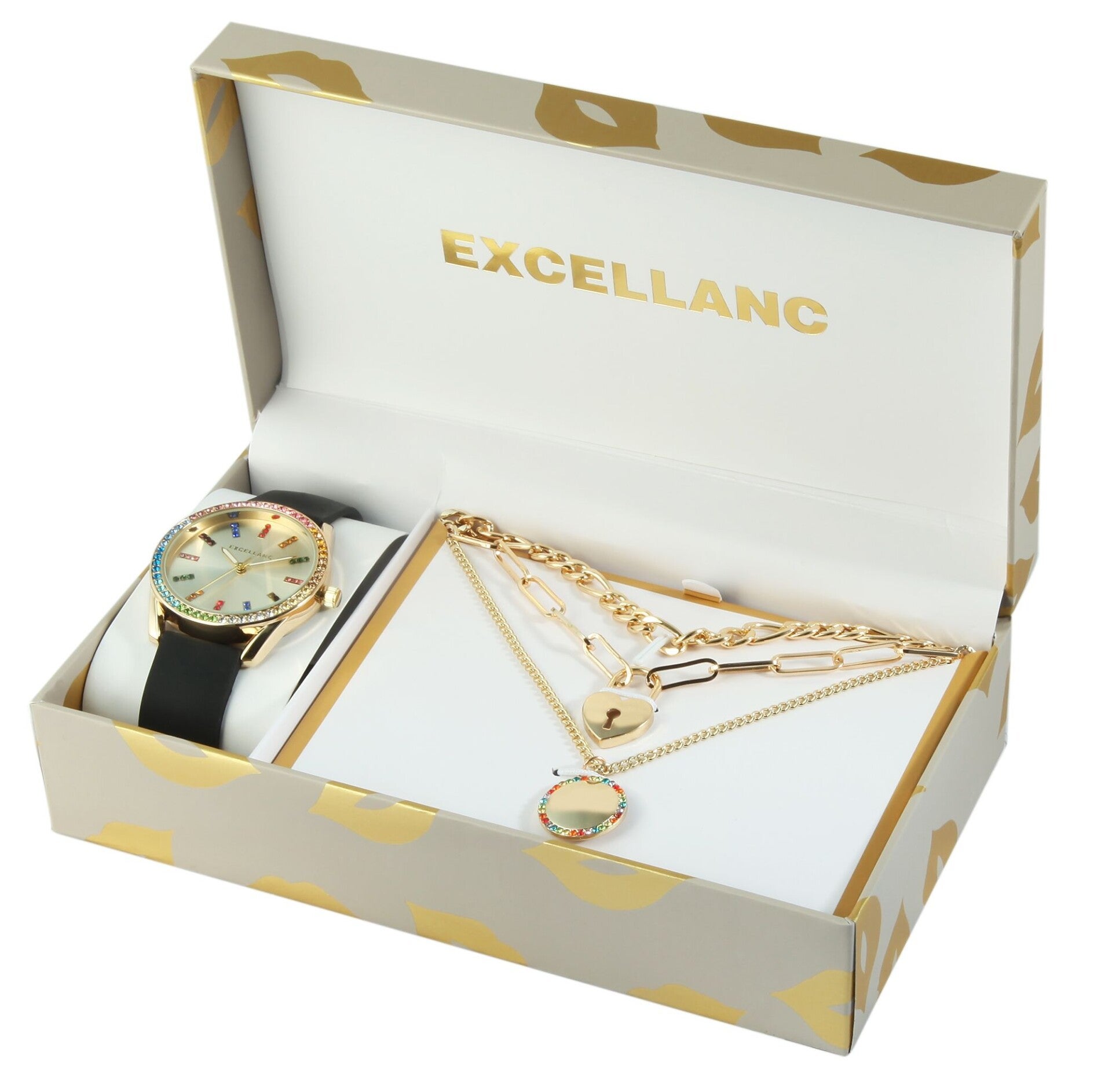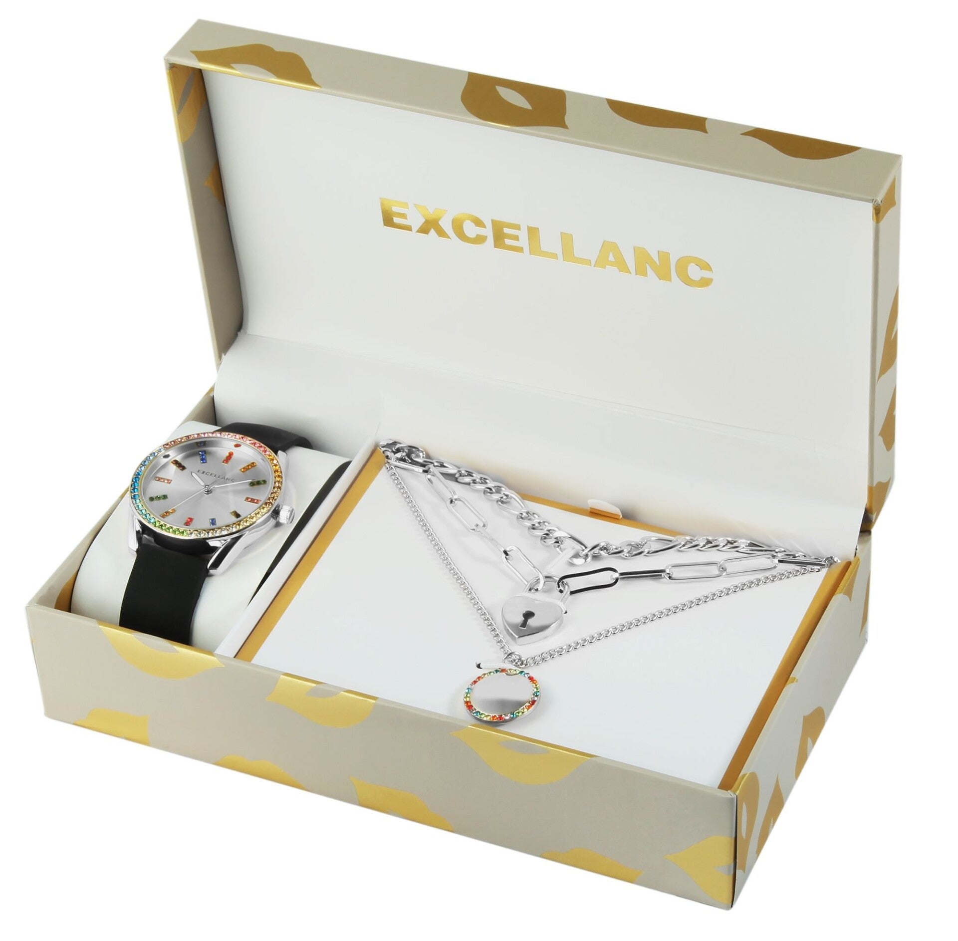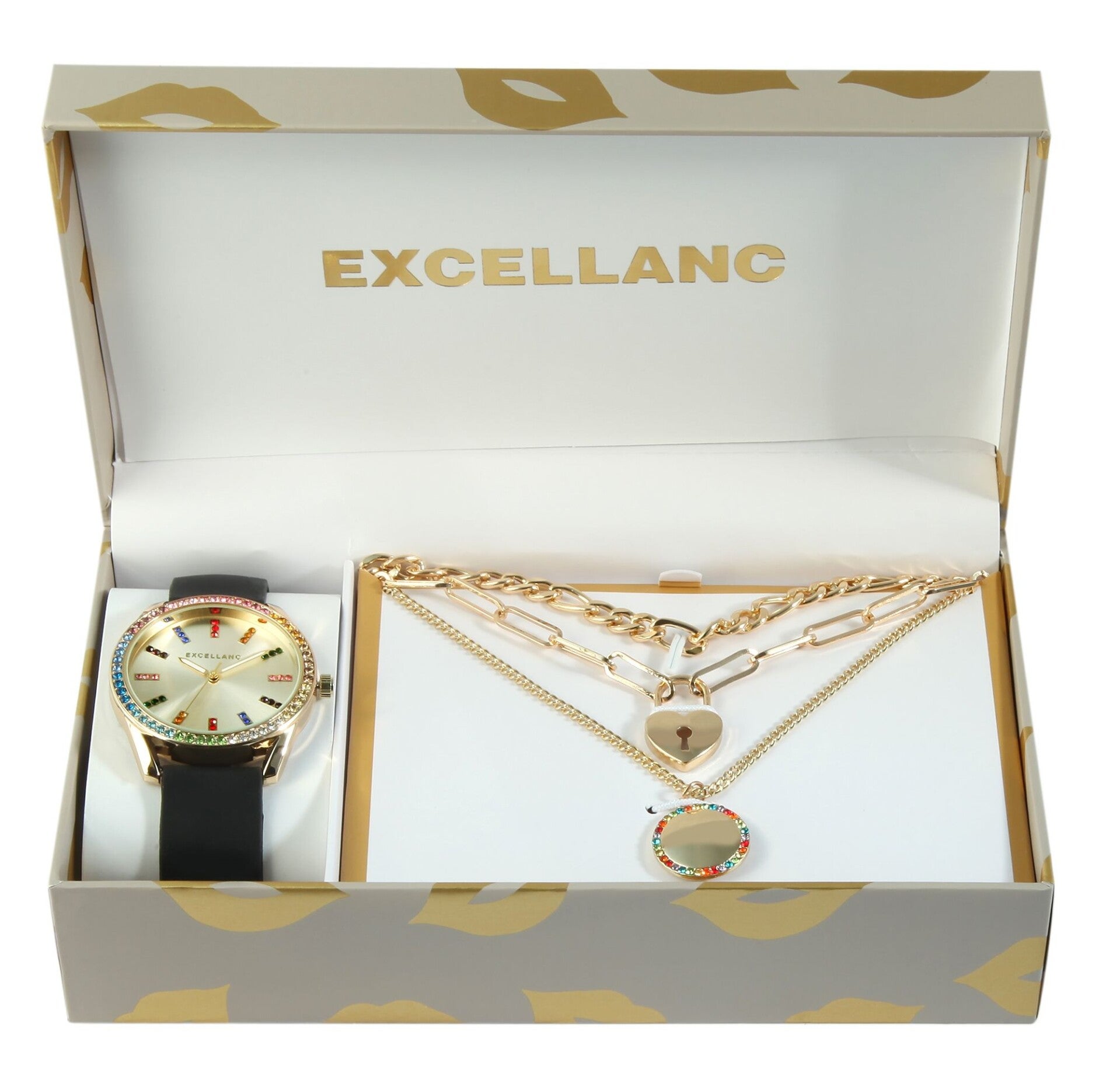 Excellanc Geschenkset mit Damenarmbanduhr und drei Ketten, bunter Similibesatz