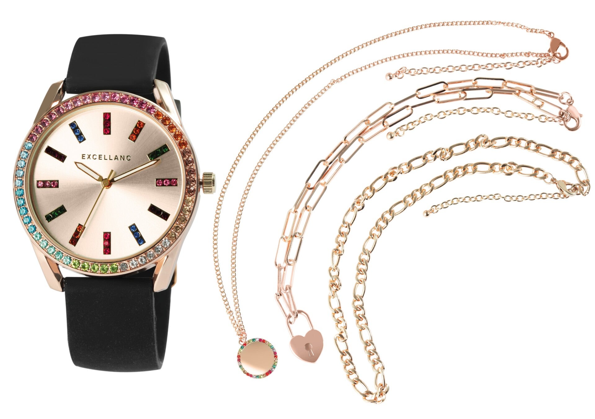 #Excellanc #DamenschmuckSet #BunterStrass #Damenarmbanduhr #Silikonarmband #HalskettenSet #LayeringLook #Schmuckliebe #GeschenkideeDamen #ModischerSchmuck #FarbenfroheAccessoires #Damenaccessoires #Strassuhr #Herzanhänger