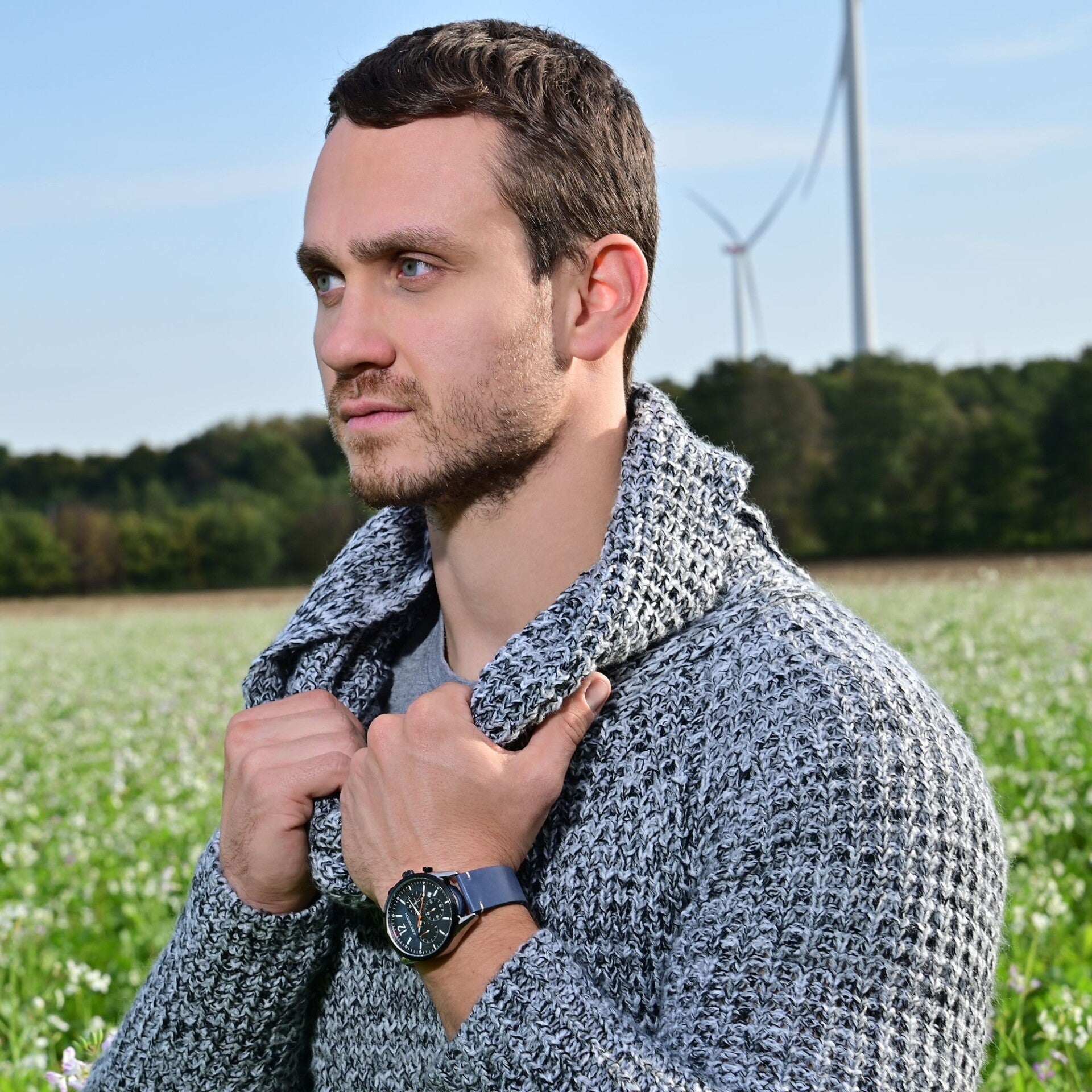 Ein weiteres Highlight sind die mit Superluminova beschichteten Zeiger und Indexe, die auch bei Dunkelheit eine optimale Ablesbarkeit garantieren. Das Echtlederarmband mit einer Breite von 20 mm schmiegt sich angenehm ums Handgelenk und wird mit einer Edelstahl-Dornschließe gesichert. Mit einer Wasserdichtigkeit von 3 bar ist der Chronograph gegen Spritzwasser geschützt – ideal für den Alltag.