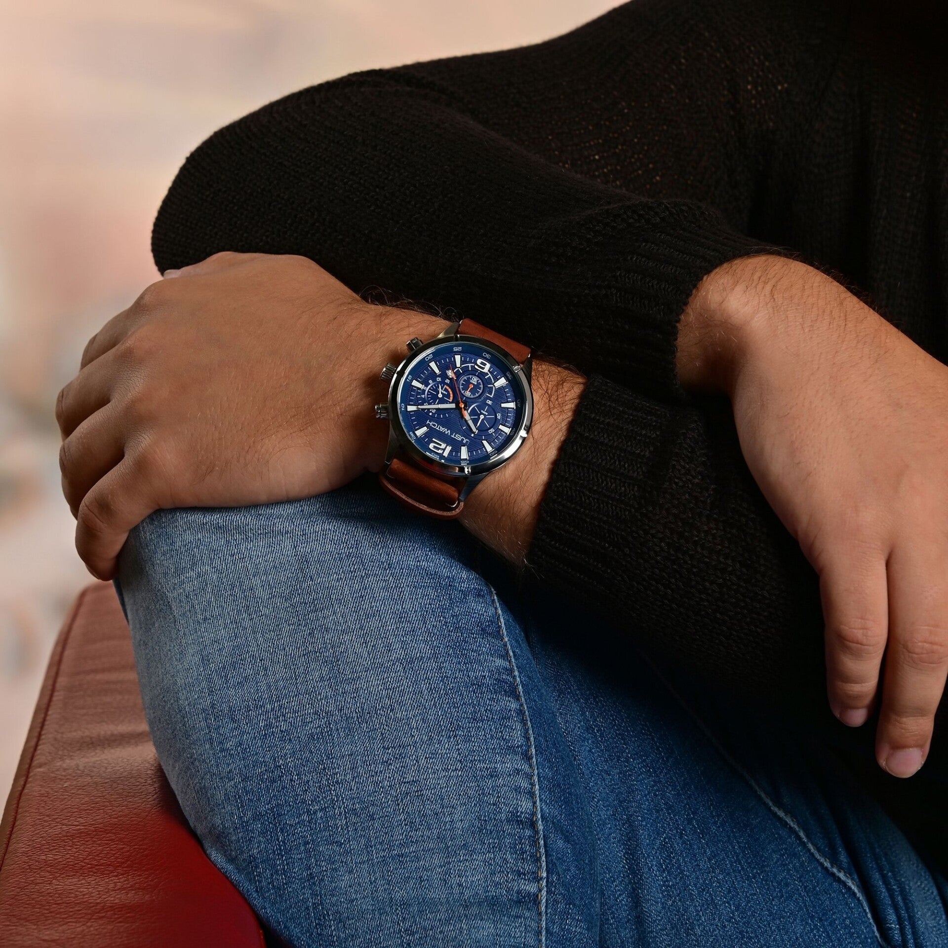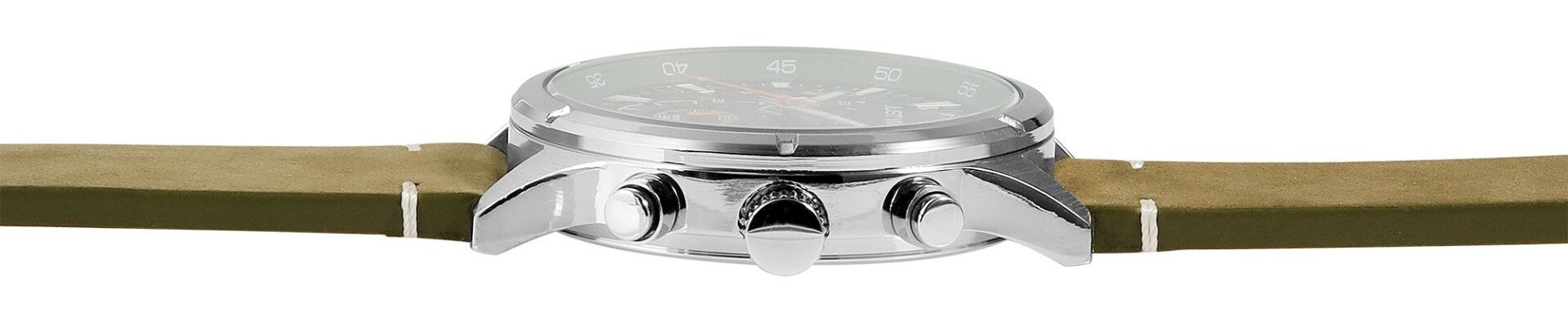 Die Just Watch Herrenuhr „Evander“ verbindet kraftvolles Design mit nützlicher Funktionalität. Der markante Chronograph mit einem Gehäusedurchmesser von 47 mm wird durch ein weiches, angerautes Echtlederarmband ergänzt, das für hervorragenden Tragekomfort und eine stilvolle Optik sorgt.
