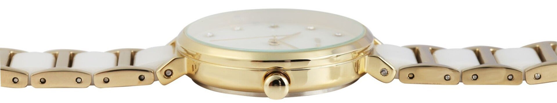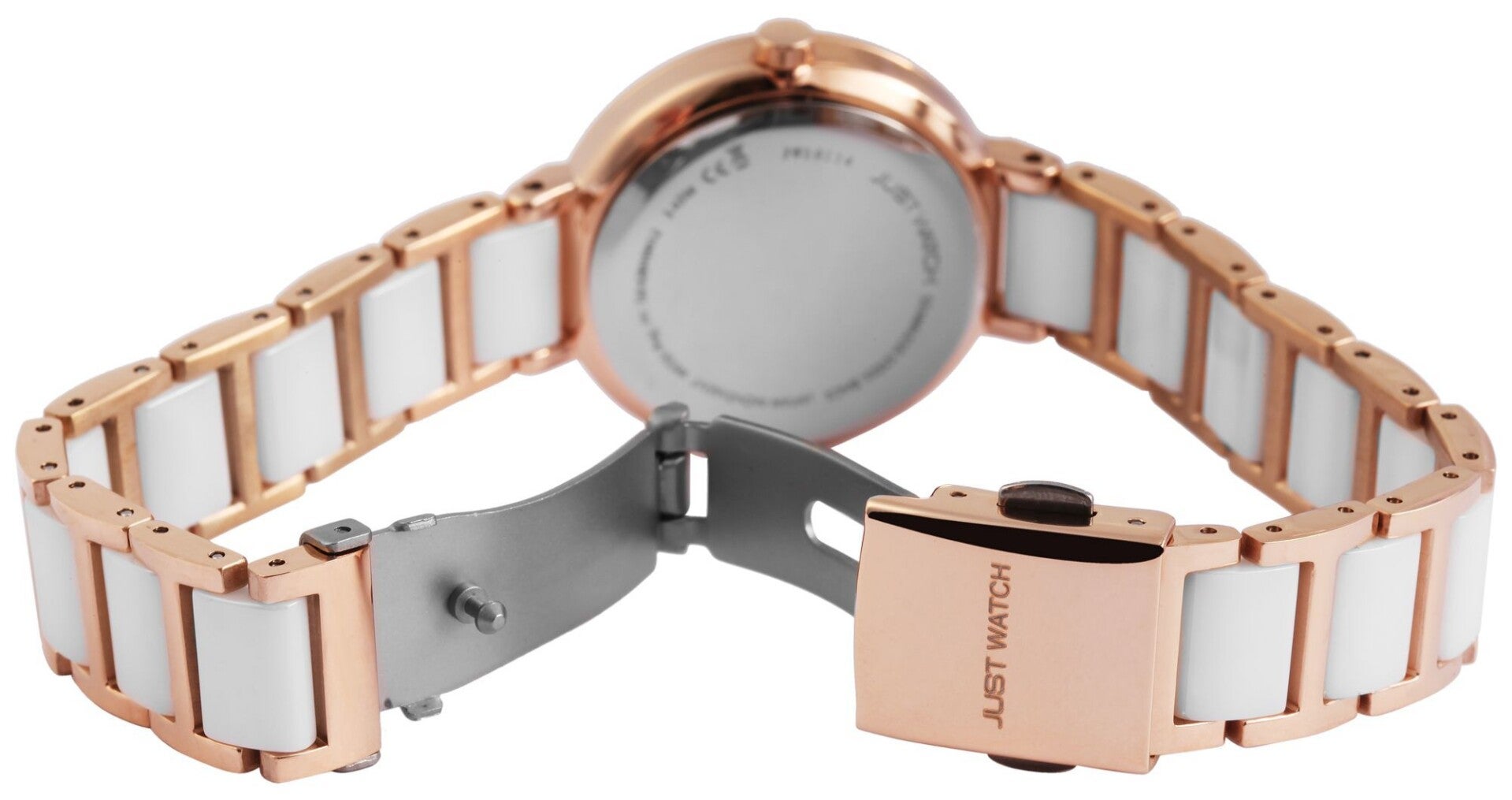 Besonderes Highlight ist das zweifarbige Gliederarmband aus hochwertigem Edelstahl und Keramikelementen, das mit einer Faltschließe bequem und sicher am Handgelenk sitzt. Die Uhr ist bis 3 bar wasserdicht und bietet somit Schutz vor Spritzwasser.