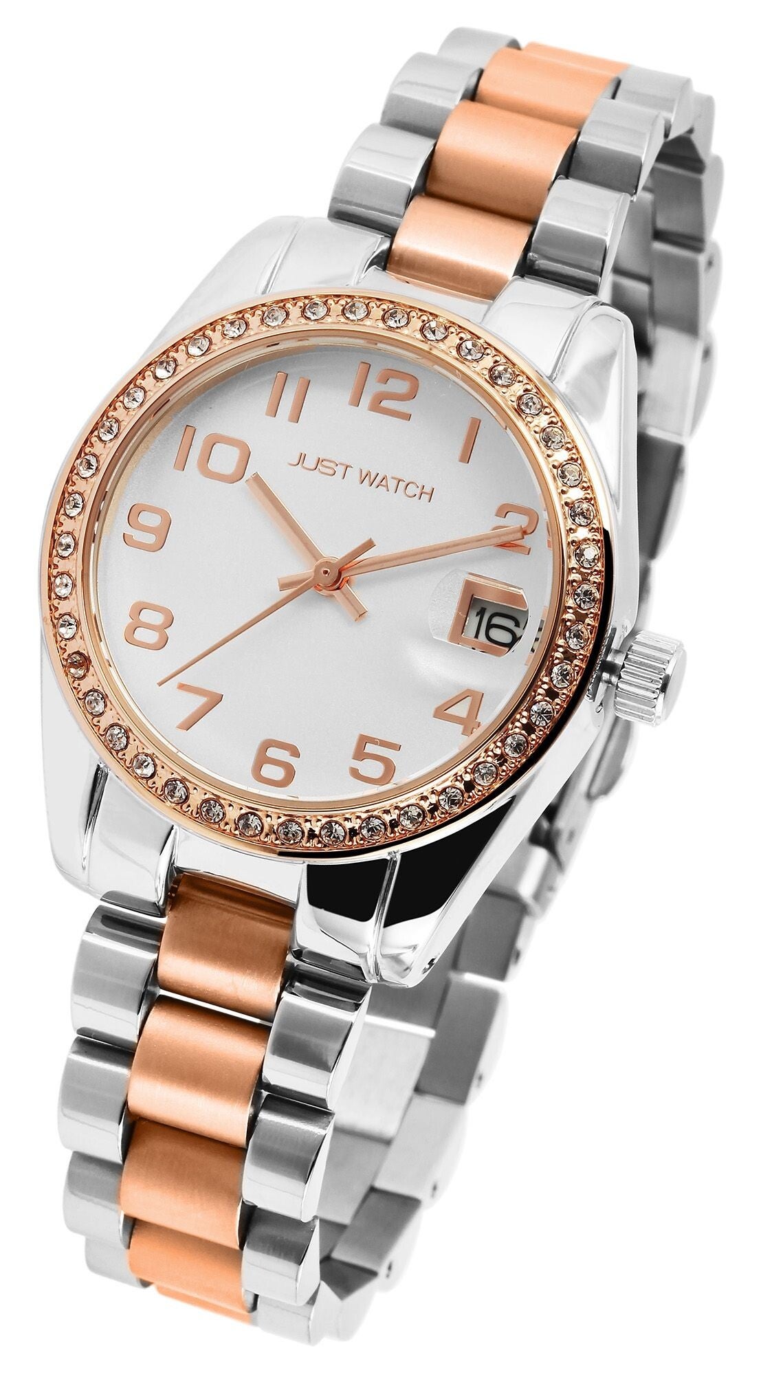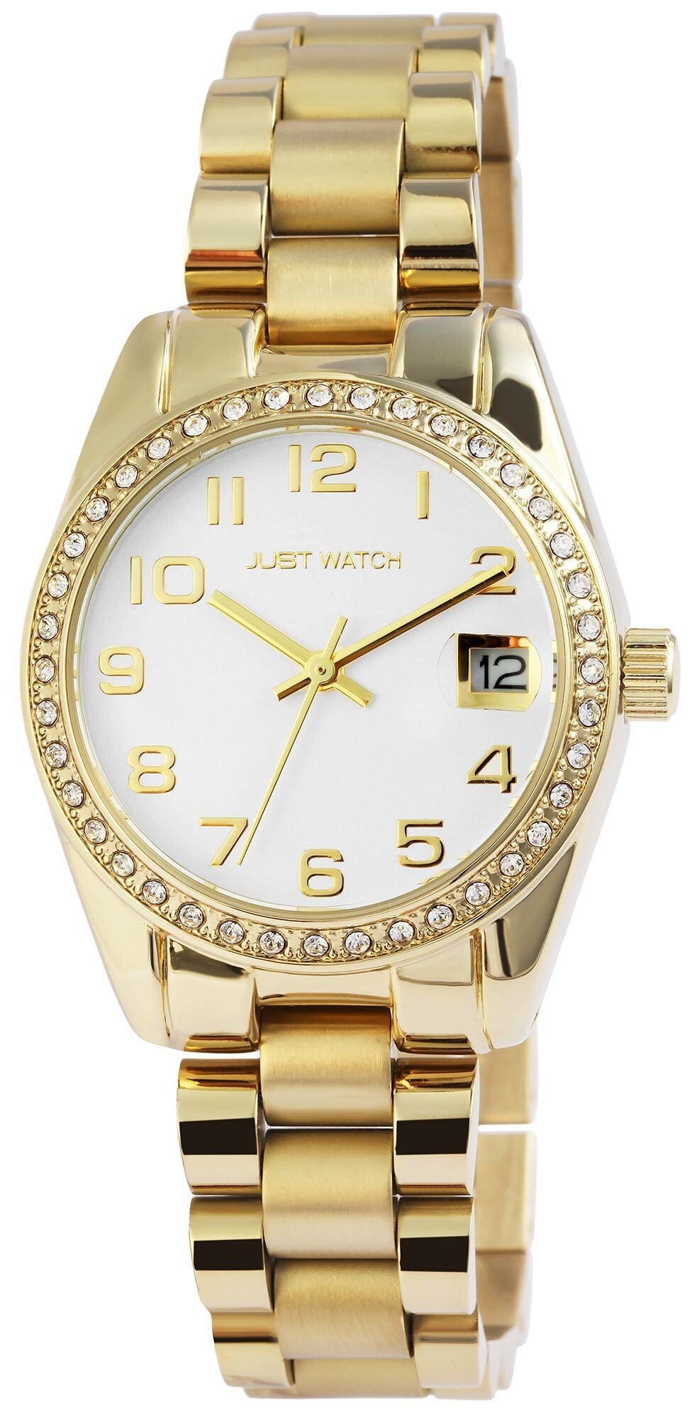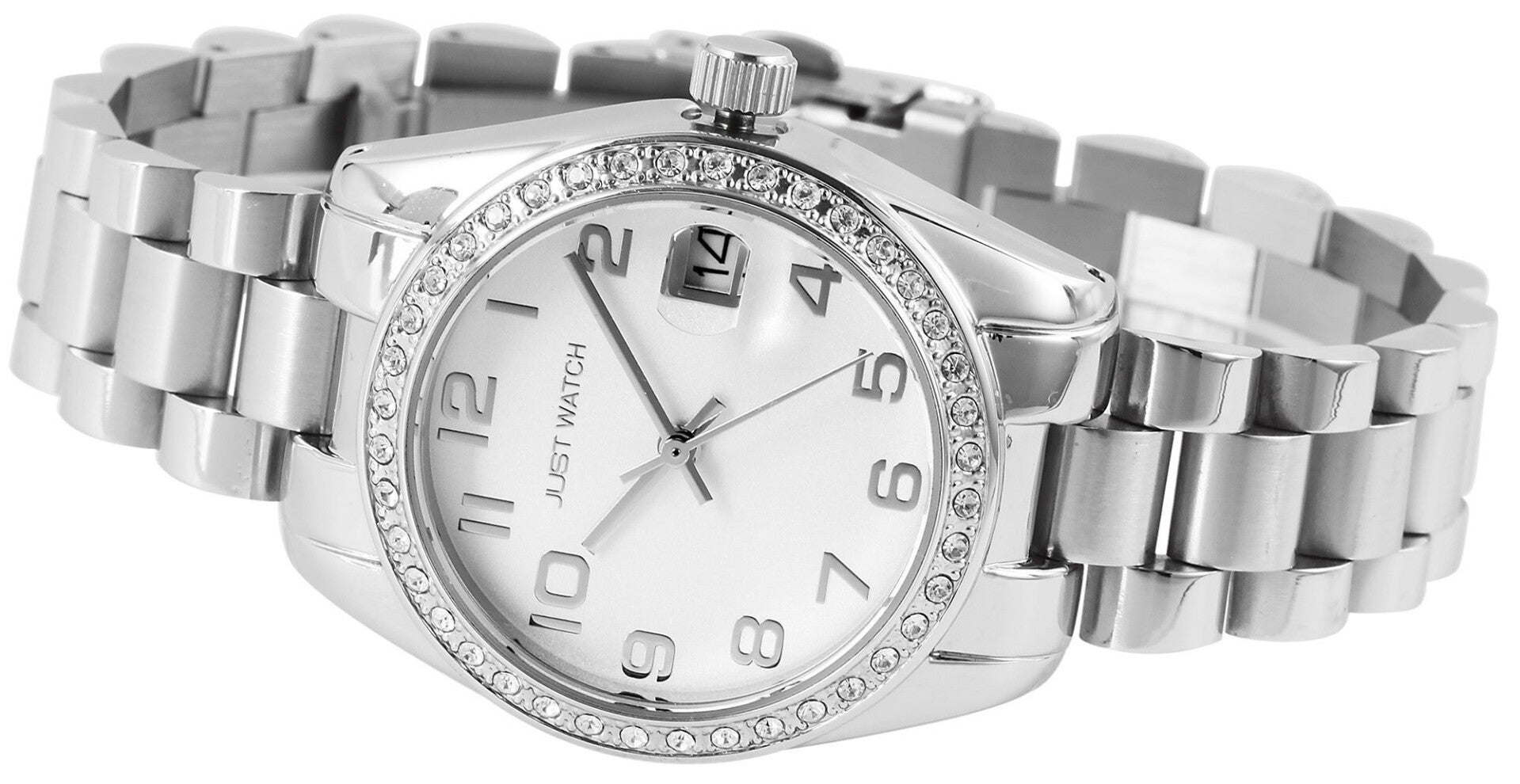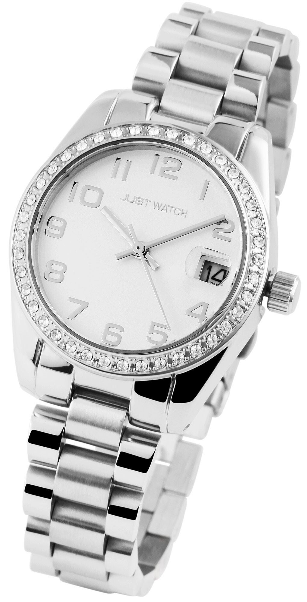 Die analoge 3-Zeiger Damenarmbanduhr der Marke Just Watch verfügt über ein hochwertiges Quarzuhrwerk mit Datumsanzeige. Das Edelstahlarmband fügt sich aus vielen miteinander verbundenen Elementen zusammen. Es hat eine Anstoßbreite von 16 mm und lässt sich mit einer Edelstahlfaltschließe öffnen und schließen. Die Gesamtlänge der Uhr beträgt 19 cm. Das Metallgehäuse mit Mineralglas hat eine Abmessung von 33 mm im Durchmesser und einer Gehäusehöhe von 10 mm. Ein optisches Highlight ist die Lünette der Uhr. Diese ist mit 40 Similisteinen besetzt und macht die Armbanduhr zu einem unübersehbaren Hingucker. Der Gehäuseboden ist aus Edelstahl gefertigt und die Uhr hat eine Wasserdichtigkeit von 3 bar/ 5 bar. Das Zifferblatt ist einfarbig und die Zeiger und Ziffern haben dieselbe Farbe. Als Zubehör zu Ihrem Produkt erhalten Sie eine Garantiekarte und eine Originalbox der Marke Just Watch.