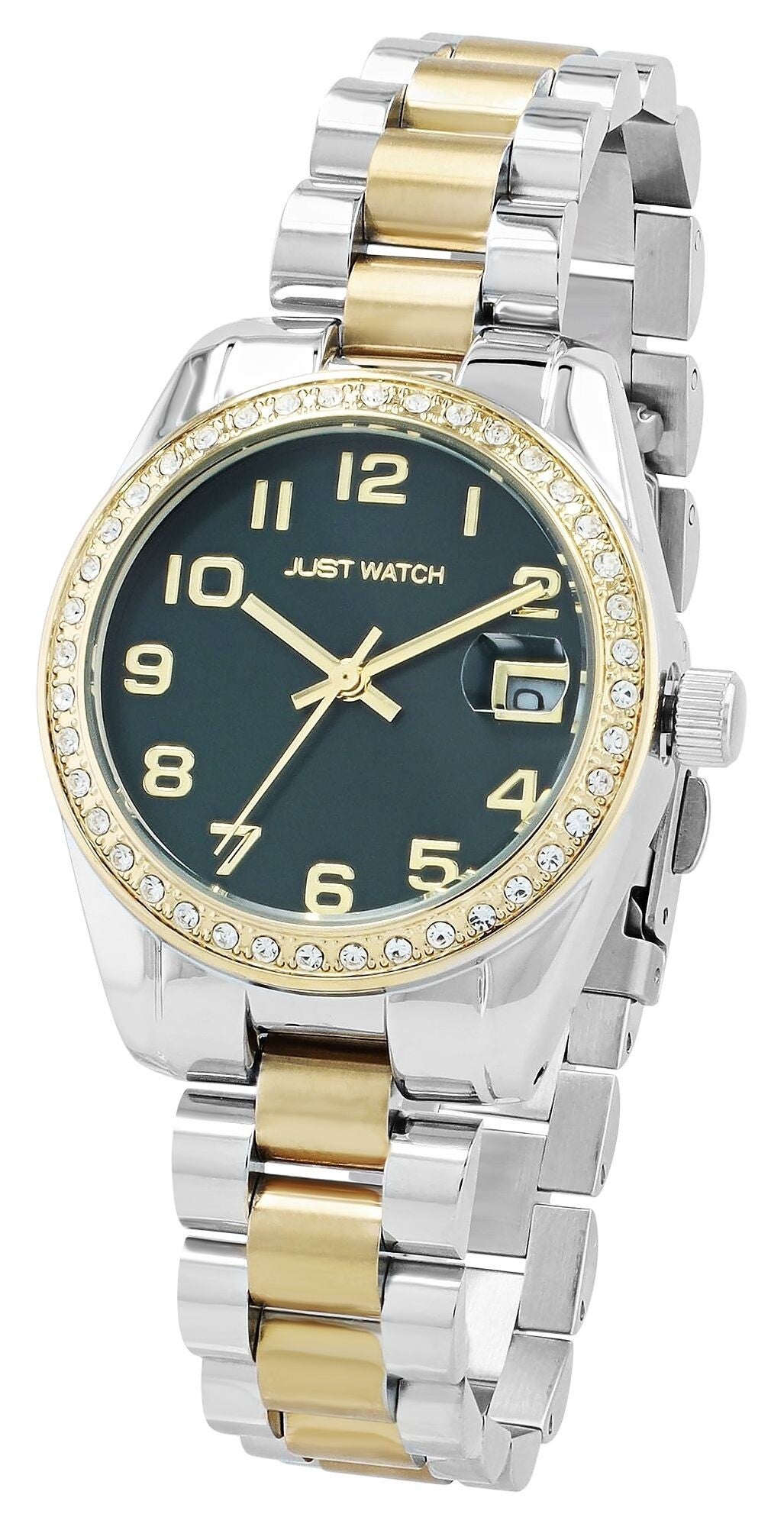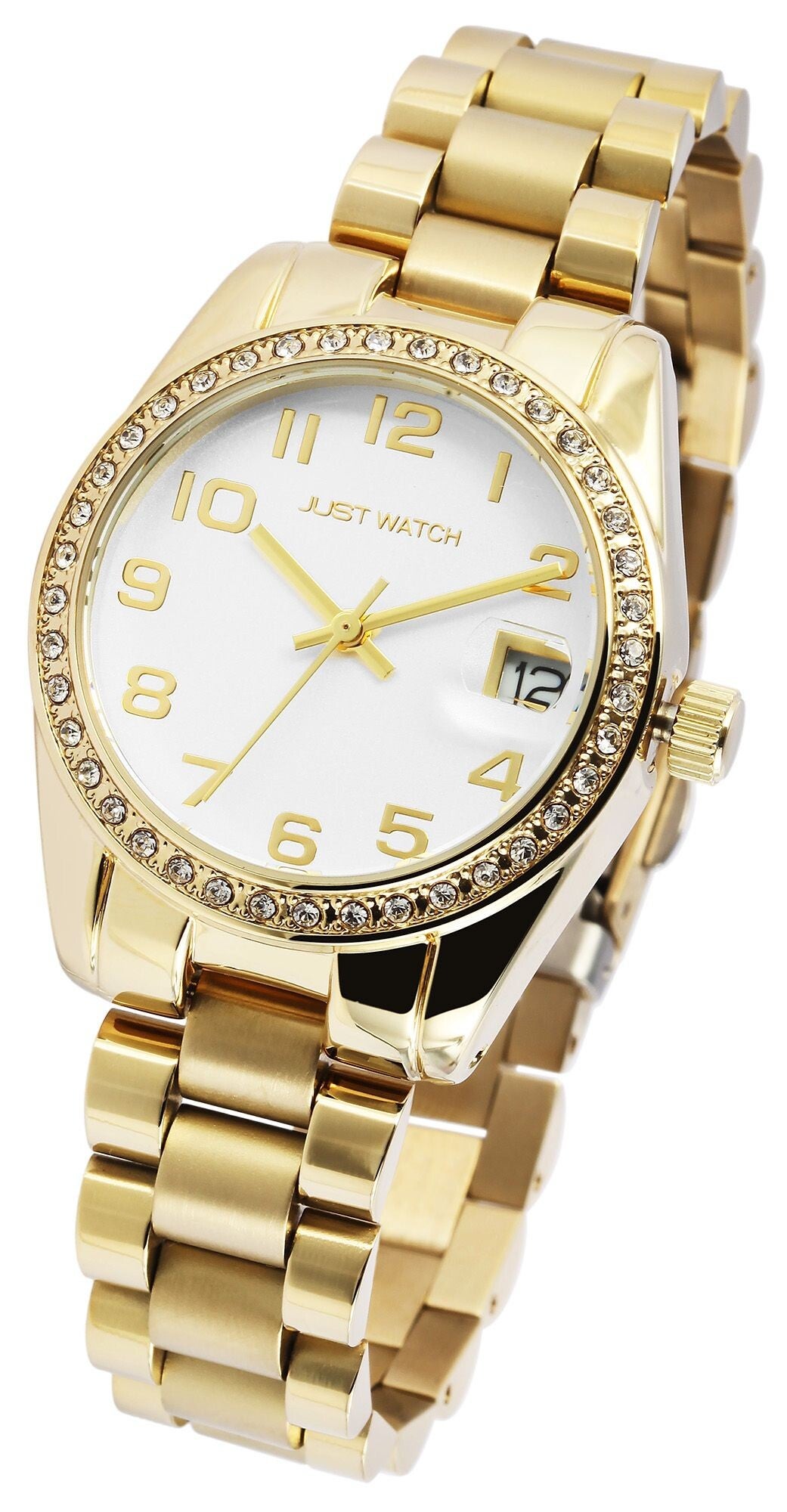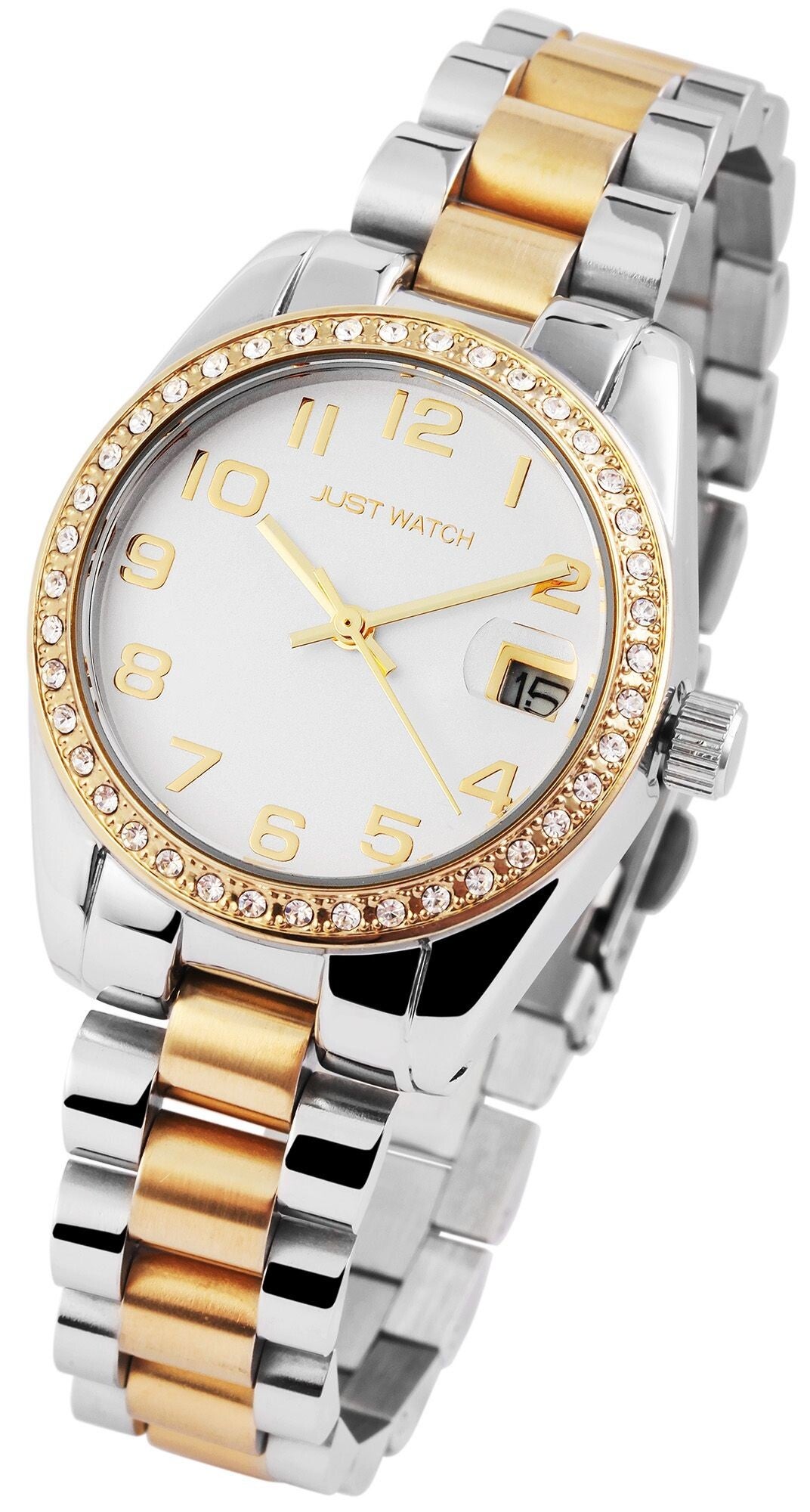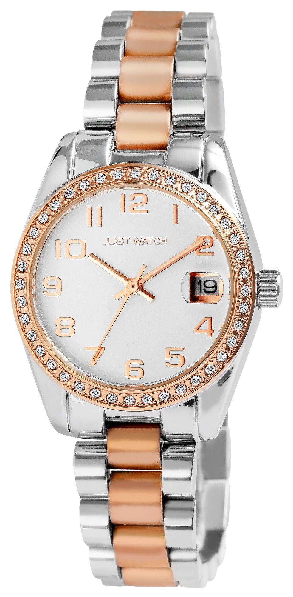 Die analoge 3-Zeiger Damenarmbanduhr der Marke Just Watch verfügt über ein hochwertiges Quarzuhrwerk mit Datumsanzeige. Das Edelstahlarmband fügt sich aus vielen miteinander verbundenen Elementen zusammen. Es hat eine Anstoßbreite von 16 mm und lässt sich mit einer Edelstahlfaltschließe öffnen und schließen. Die Gesamtlänge der Uhr beträgt 19 cm. Das Metallgehäuse mit Mineralglas hat eine Abmessung von 33 mm im Durchmesser und einer Gehäusehöhe von 10 mm. Ein optisches Highlight ist die Lünette der Uhr. Diese ist mit 40 Similisteinen besetzt und macht die Armbanduhr zu einem unübersehbaren Hingucker. Der Gehäuseboden ist aus Edelstahl gefertigt und die Uhr hat eine Wasserdichtigkeit von 3 bar/ 5 bar. Das Zifferblatt ist einfarbig und die Zeiger und Ziffern haben dieselbe Farbe. Als Zubehör zu Ihrem Produkt erhalten Sie eine Garantiekarte und eine Originalbox der Marke Just Watch.