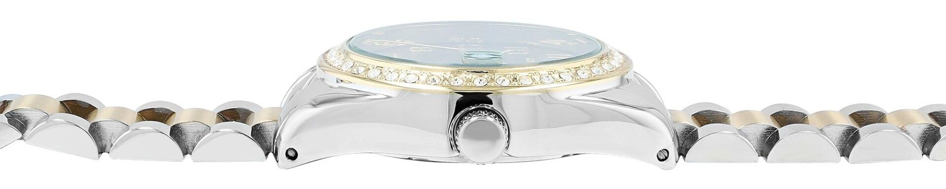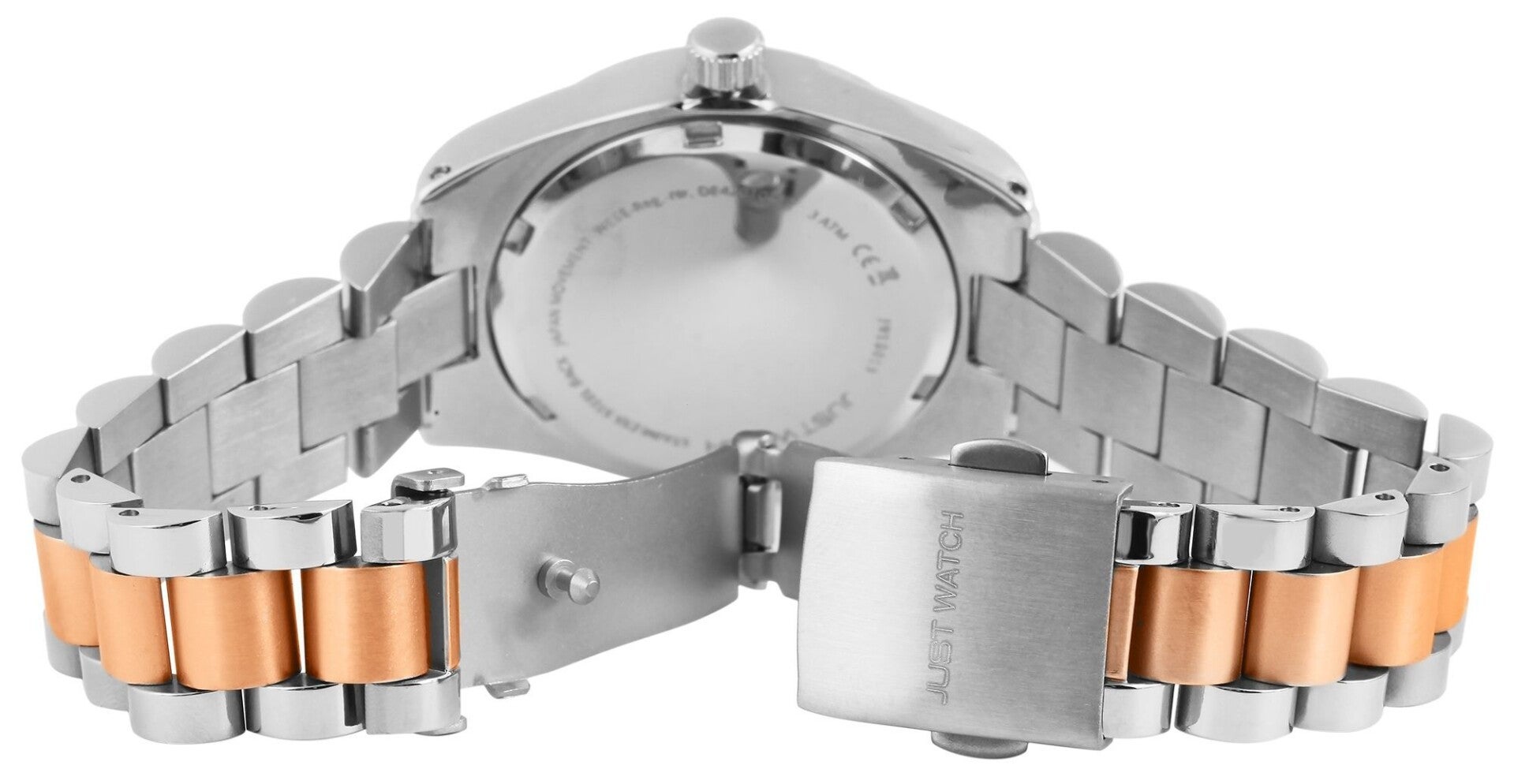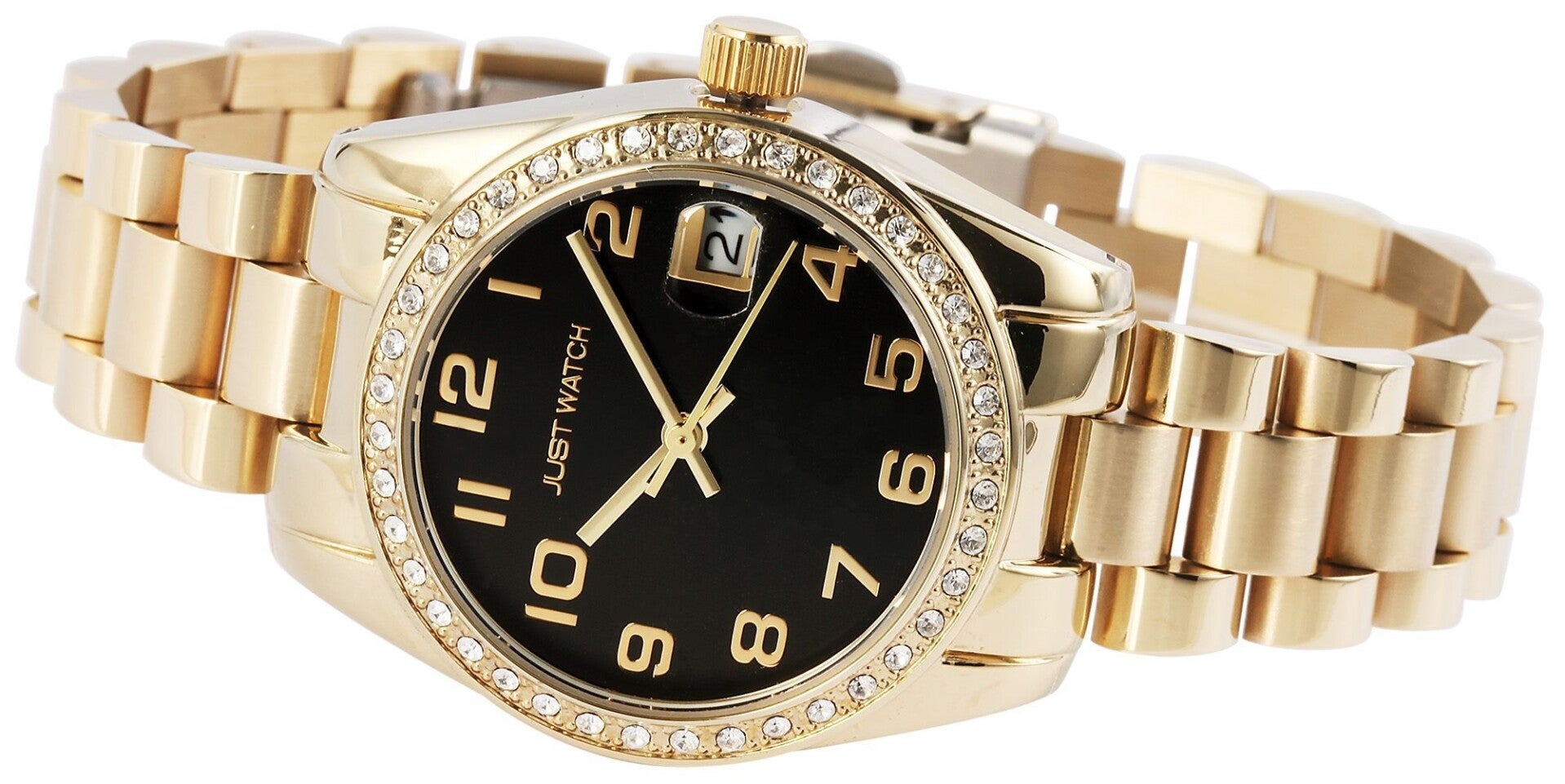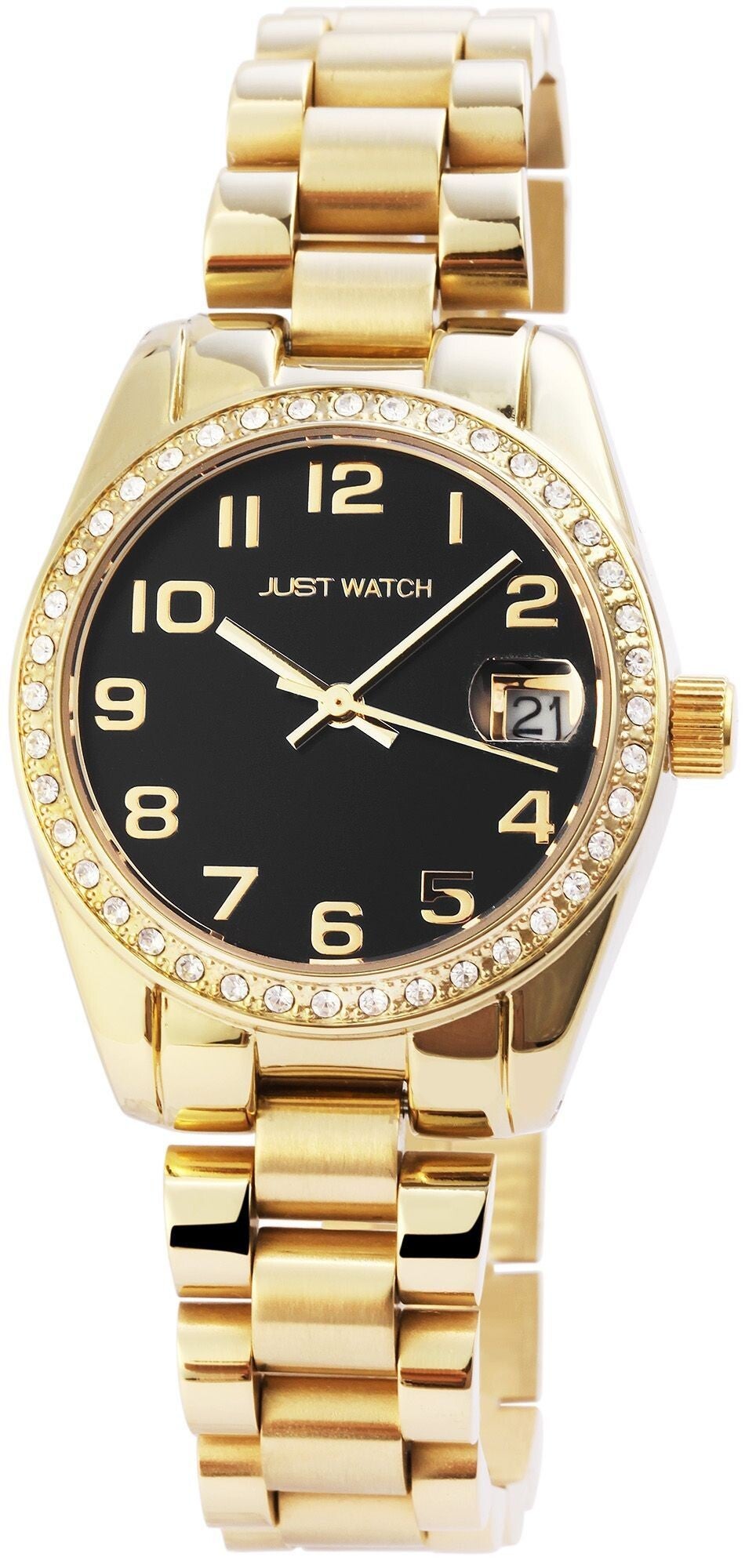 Die analoge 3-Zeiger Damenarmbanduhr der Marke Just Watch verfügt über ein hochwertiges Quarzuhrwerk mit Datumsanzeige. Das Edelstahlarmband fügt sich aus vielen miteinander verbundenen Elementen zusammen. Es hat eine Anstoßbreite von 16 mm und lässt sich mit einer Edelstahlfaltschließe öffnen und schließen. Die Gesamtlänge der Uhr beträgt 19 cm. Das Metallgehäuse mit Mineralglas hat eine Abmessung von 33 mm im Durchmesser und einer Gehäusehöhe von 10 mm. Ein optisches Highlight ist die Lünette der Uhr. Diese ist mit 40 Similisteinen besetzt und macht die Armbanduhr zu einem unübersehbaren Hingucker. Der Gehäuseboden ist aus Edelstahl gefertigt und die Uhr hat eine Wasserdichtigkeit von 3 bar/ 5 bar. Das Zifferblatt ist einfarbig und die Zeiger und Ziffern haben dieselbe Farbe. Als Zubehör zu Ihrem Produkt erhalten Sie eine Garantiekarte und eine Originalbox der Marke Just Watch.