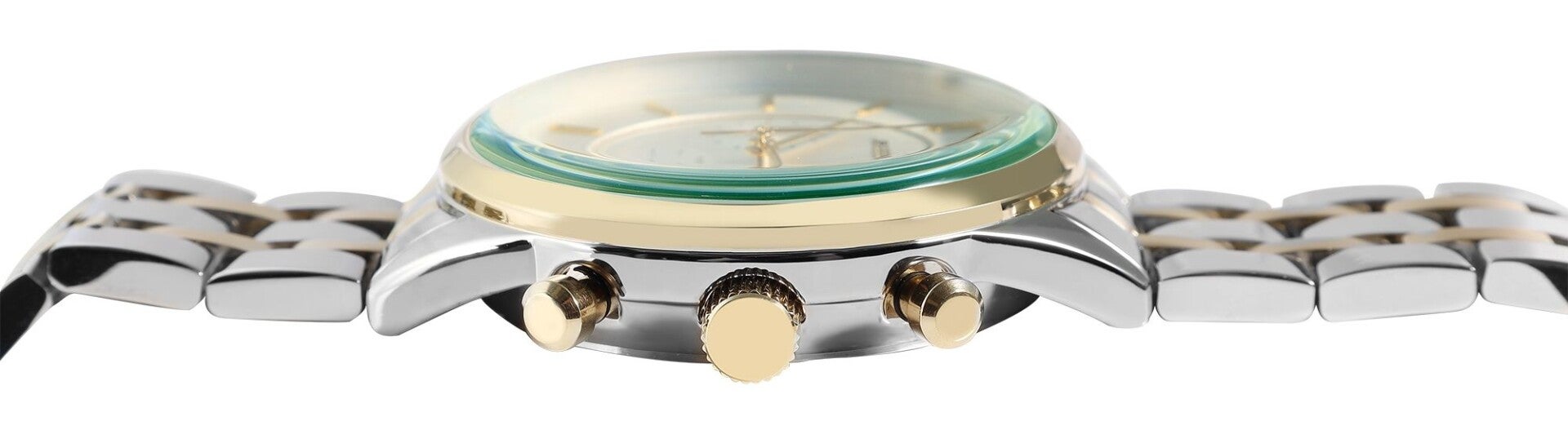 Im Inneren arbeitet ein präzises japanisches Quarzwerk (VD53) mit Stoppfunktion, Datumsanzeige und 24-Stunden-Anzeige. Drei funktionale Totalisatoren sorgen für einen sportlich-eleganten Look. Die Uhr ist bis 3 ATM wasserdicht und somit bestens geeignet für den Alltag.