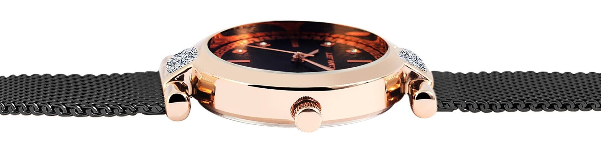 Das elegante Metallgehäuse mit IP-Beschichtung misst 32 mm im Durchmesser bei einer Gehäusehöhe von 8 mm. Geschützt wird das fein gestaltete Zifferblatt durch robustes Mineralglas, das einen klaren Blick auf die stilvollen Details bietet: farblich abgestimmte Zeiger und Indexe, funkelnde Similisteine als Punktindizes sowie Zierelemente bei sechs und zwölf Uhr machen die Uhr zu einem echten Blickfang.