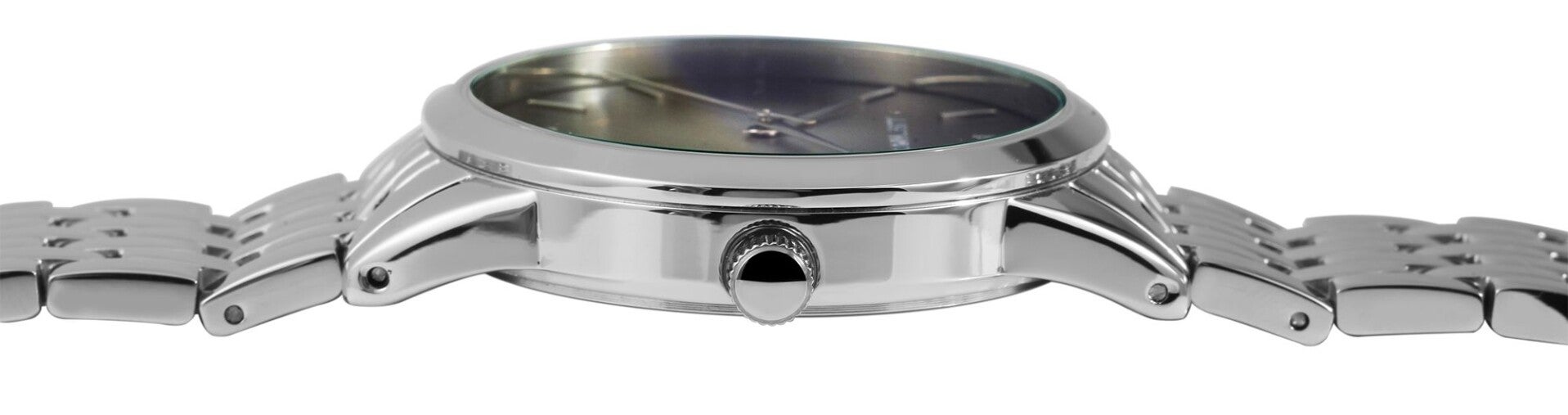 Das minimalistisch gestaltete Zifferblatt mit Punktindizes wird durch Zeiger und Indexe in Gehäusefarbe abgerundet. Eine Datumsanzeige auf drei Uhr sorgt für zusätzliche Übersicht. Farben wie Blau, Braun oder Grün setzen je nach Ausführung stilvolle Akzente und machen die Uhr zu einem vielseitigen Begleiter – ob casual oder business.