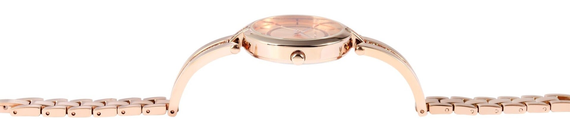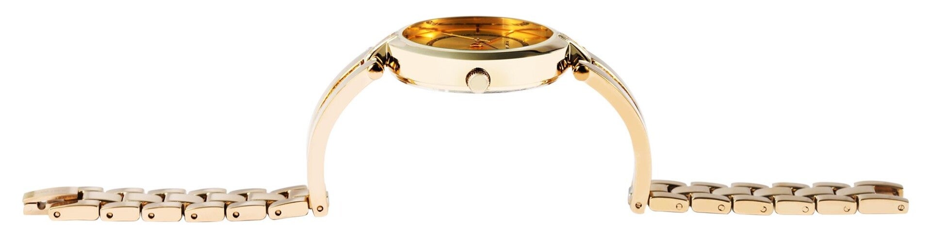 Ein 14 mm breites Edelstahl-Gliederarmband mit praktischem Hakenverschluss sorgt für sicheren Halt und angenehmen Tragekomfort. Mit einer Gesamtlänge von 19 cm schmiegt sich die Uhr sanft ans Handgelenk. Farblich abgestimmte Zeiger und Indexe fügen sich harmonisch in das Design ein und machen die Uhr zu einem dezenten Blickfang – ob in Gold, Roségold oder Silber.