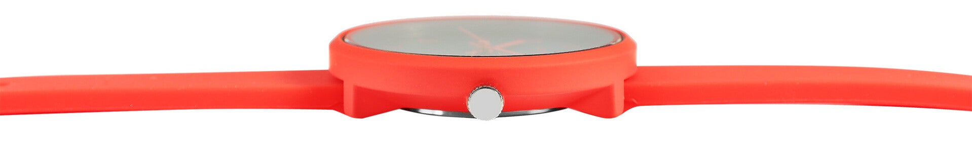 Das Silikonarmband mit 16 mm Breite liegt angenehm am Handgelenk und wird sicher mit einer klassischen Dornschließe verschlossen. Farblich harmoniert das Armband ideal mit dem Gehäuse und unterstreicht die frische, verspielte Optik der Uhr. Das klar gestaltete Zifferblatt mit arabischen Ziffern rundet den Look ab und sorgt für eine gute Ablesbarkeit.