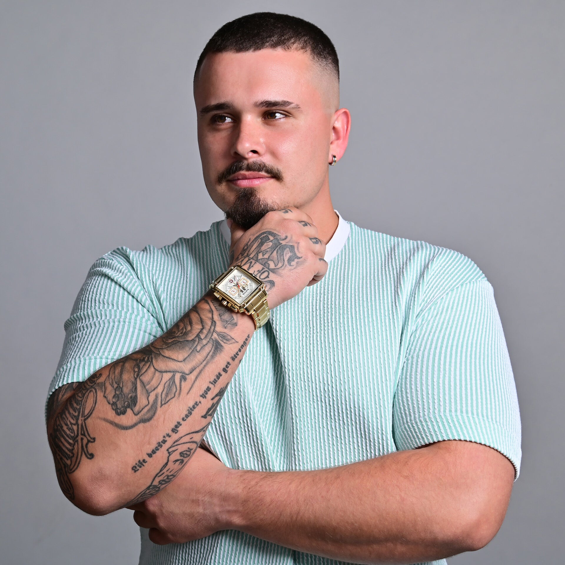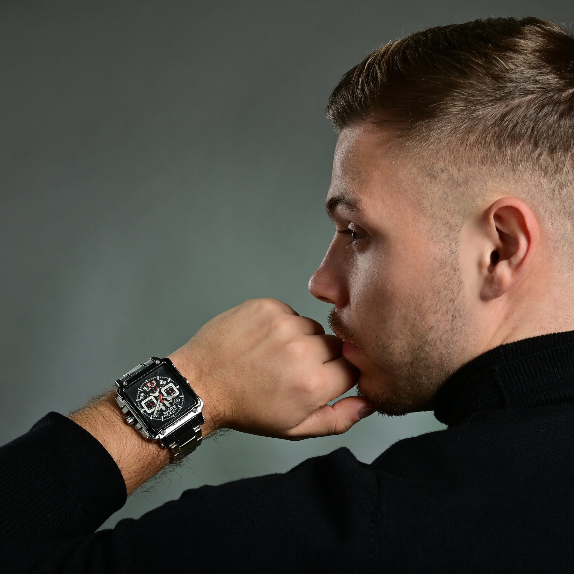 Die Raptor Limited „Oscar“ ist der Inbegriff von maskuliner Stärke und markantem Stil. Mit ihrem großzügig dimensionierten, rechteckigen Gehäuse (56 x 52 mm) und dem konisch zulaufenden Edelstahlarmband (24 mm) setzt diese Herrenuhr ein unübersehbares Statement. Die Faltschließe garantiert dabei sicheren Halt und angenehmen Tragekomfort – perfekt für den Alltag und besondere Anlässe.