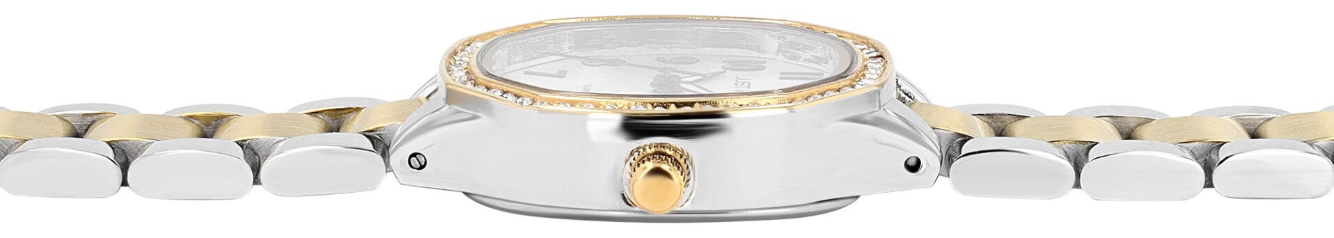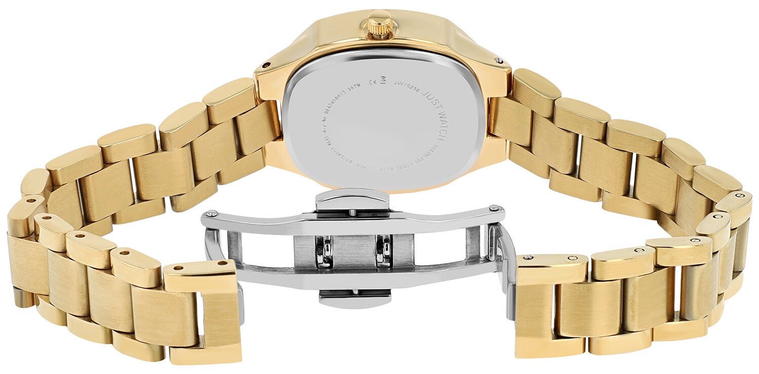 Die Just Watch Elva vereint modernes Design mit klassischer Raffinesse – ein stilvolles Accessoire für jede Frau, die Wert auf Ausdruck und Qualität legt. Das abgerundete Tonneau-Gehäuse (35 x 28 x 8 mm) verleiht der Uhr eine feminine Silhouette, während die mit Similisteinen besetzte Lünette funkelnde Akzente setzt.