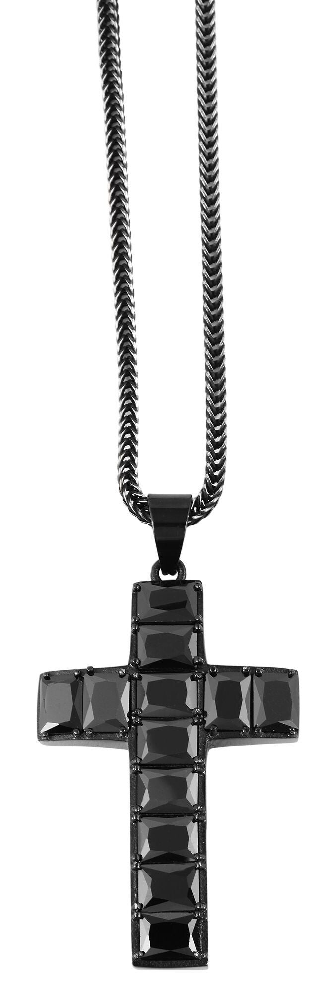 Das Highlight dieser modischen Damenkette ist der detaillierte Kreuzanhänger mit einer Breite von 39 mm und einer Stärke von 6 mm. Der Anhänger ist mit funkelndem Besatz versehen, der das Schwarz glänzen lässt und dem Schmuckstück einen Hauch von Glamour verleiht. Der stabile Edelstahl-Karabiner sorgt für sicheren Halt und eine einfache Handhabung.