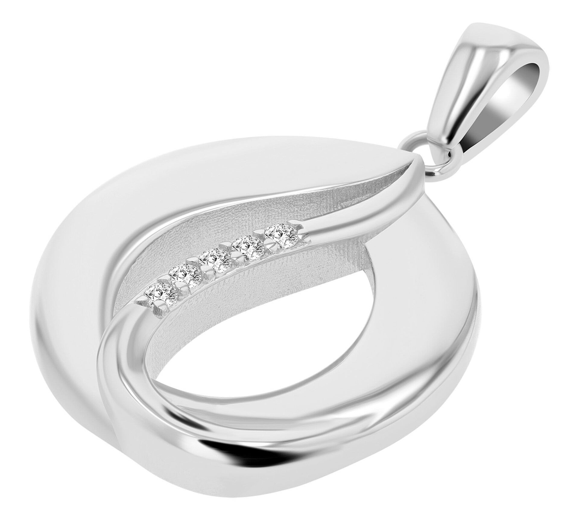 Fünf präzise eingefasste, weiß funkelnde Zirkoniasteine fangen das Licht ein und reflektieren es mit strahlender Intensität. Die polierte Oberfläche sorgt für zusätzlichen Glanz und hebt die geschwungene Linienführung des Designs perfekt hervor.
