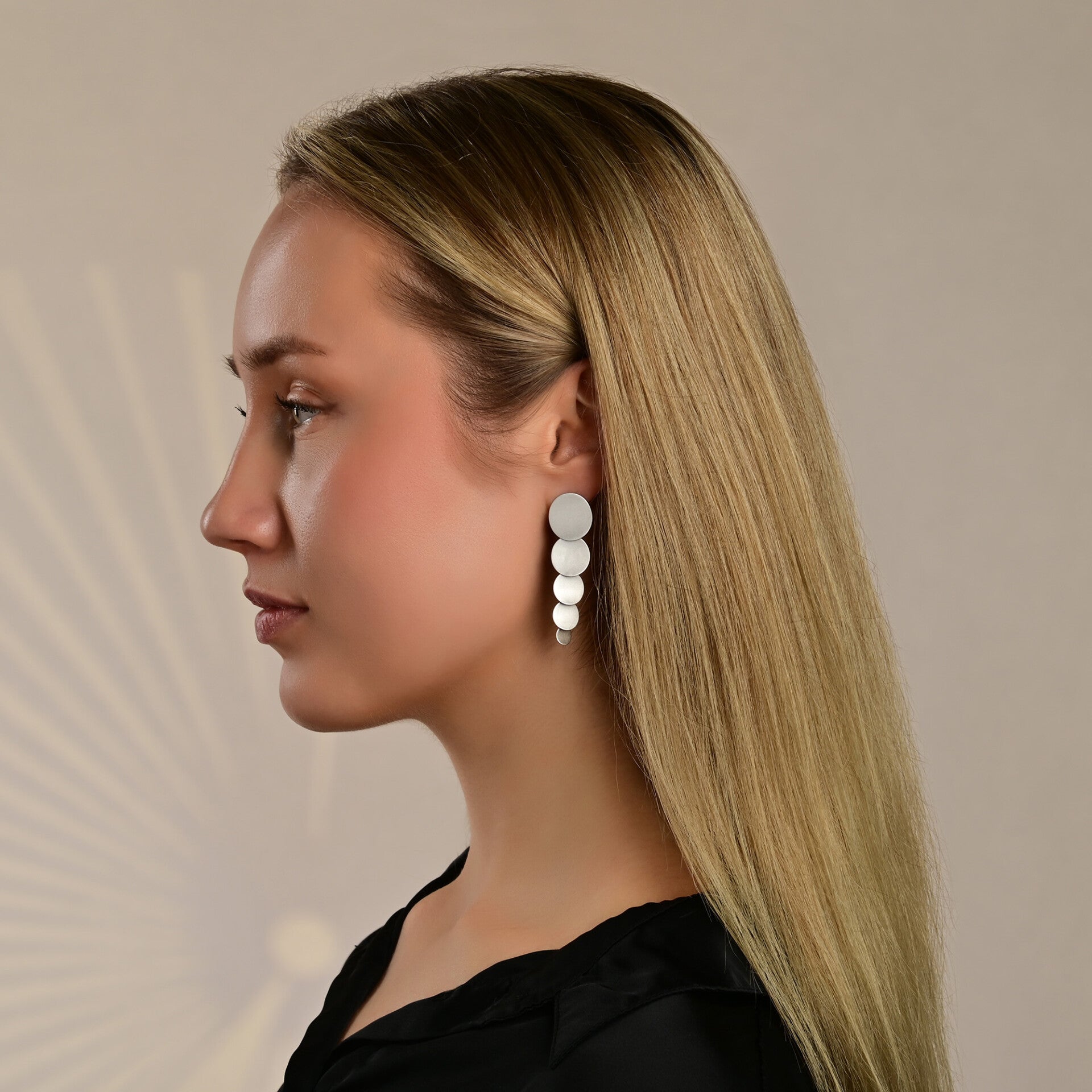 Gefertigt aus rhodiniertem 925/- Echtsilber und versehen mit einer mattierten Oberfläche, strahlen diese Ohrhänger eine zurückhaltende Eleganz aus. Die beweglichen Elemente mit einer zarten Materialstärke von nur 1 mm sorgen für ein federleichtes Tragegefühl und eine moderne, feminine Ausstrahlung.