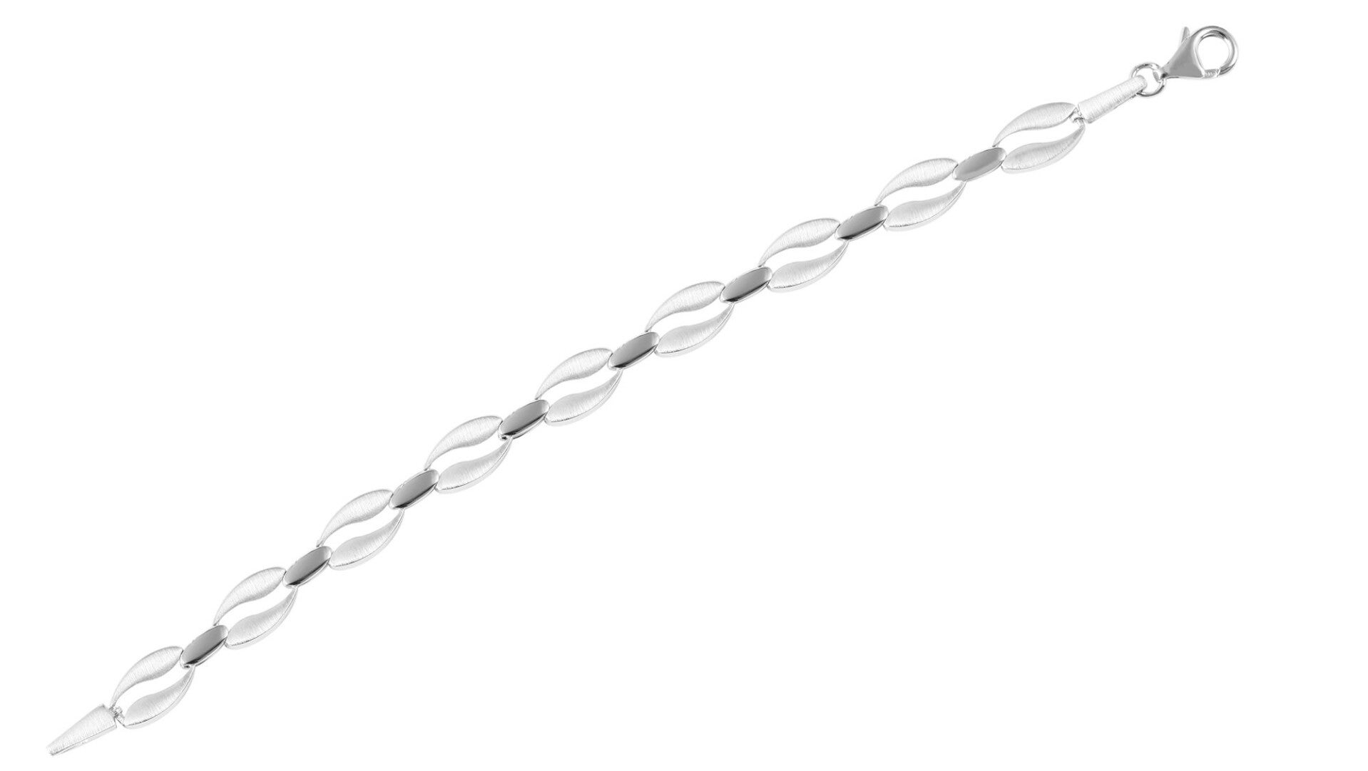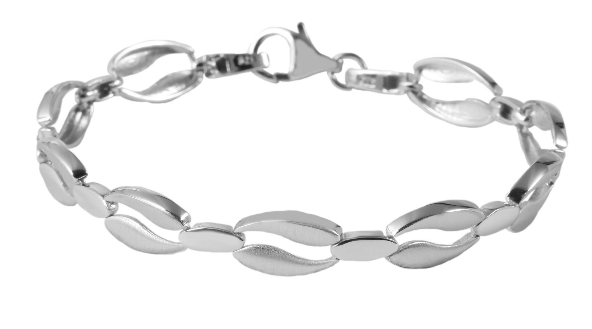 Das Armband „Malia“ begeistert mit einem harmonischen Design aus geschwungenen, abwechselnd mattierten und polierten Elementen, die ein elegantes Gesamtbild schaffen. Gefertigt aus hochwertigem 925er Sterlingsilber und veredelt mit einer rhodinierten Oberfläche, schützt das Schmuckstück zuverlässig vor dem Anlaufen und glänzt dauerhaft in edlem Silberton.