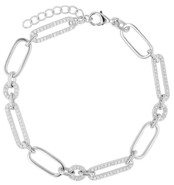 Die unterschiedlich geformten Kettenglieder in polierter Optik verleihen dem Armband seine elegante Struktur. Einzelne Elemente sind mit funkelnden Zirkoniasteinen besetzt und sorgen für dezente, aber wirkungsvolle Lichtreflexe – perfekt, um dem Handgelenk eine edle Note zu verleihen.