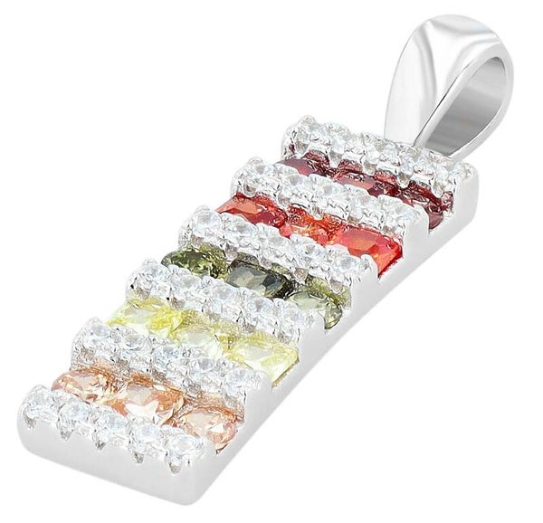 Der Anhänger, mit einer Länge von 20 mm, einer Breite von 6 mm und einer filigranen Stärke von 2 mm, ist mit 45 funkelnden Zirkoniasteinen in leuchtenden Tönen wie Rot, Orange, Gelb und Grün besetzt. Diese Farbharmonie erinnert an fallendes Laub im Sonnenlicht und macht das Schmuckstück zu einem wahren Blickfang.