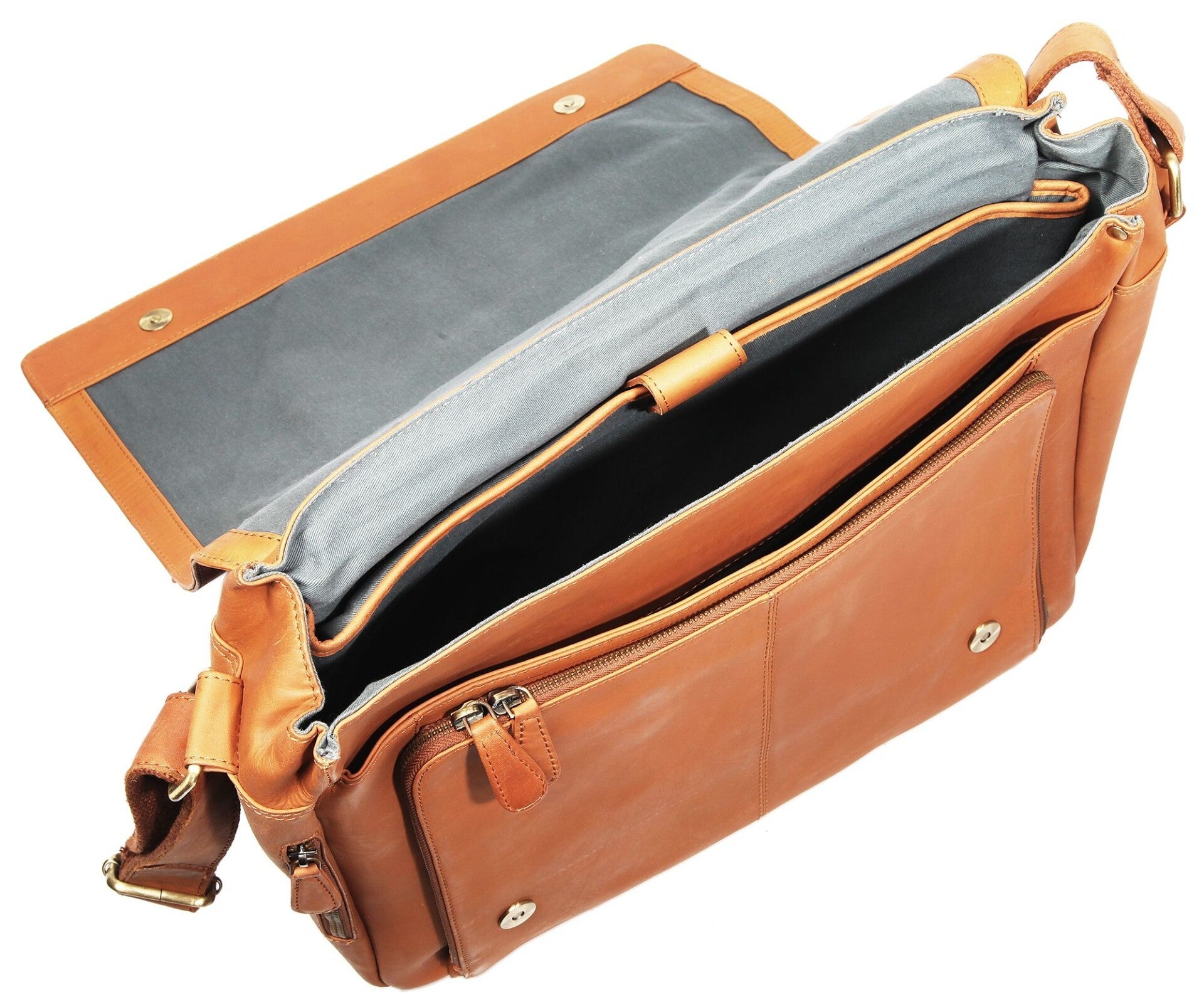 Im Inneren verbirgt sich ein clever durchdachtes System aus zwei Hauptfächern, eines davon als gepolstertes Laptopfach mit Klettverschluss – ideal für Geräte bis ca. 15 Zoll. Zudem bieten zahlreiche Organizer-Elemente Platz für Kreditkarten, Visitenkarten, Stifte, Handy und Unterlagen. Auch außen befinden sich mehrere Reißverschlussfächer, die weiteren Stauraum bieten und Ihre Essentials griffbereit halten.