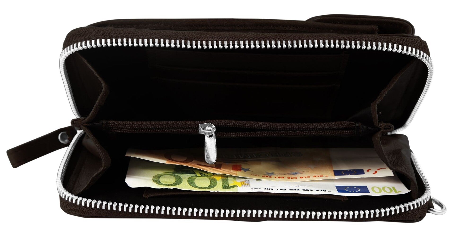 Ob iPhone 15, iPhone 15 Pro oder iPhone 15 Pro Max – in dieser Tasche findet auch dein großes Smartphone sicher Platz. Sechs Kreditkartenfächer, zwei Geldscheinfächer und ein Münzfach mit Reißverschluss sorgen dafür, dass du alles Wichtige griffbereit hast. Die separate Handytasche lässt sich komfortabel per Druckknopf öffnen und schließen.