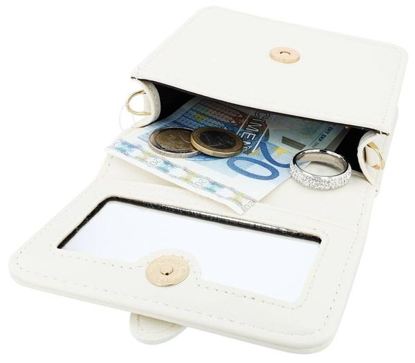 Mit einer kompakten Größe von 10 x 11 x 4 cm eignet sie sich ideal für das Verstauen kleiner Essentials. Das Hauptfach wird durch einen Druckknopfverschluss sicher verschlossen. Ein besonderes Highlight: Der integrierte Spiegel im Überschlag – ideal für schnelle Beauty-Checks unterwegs.
