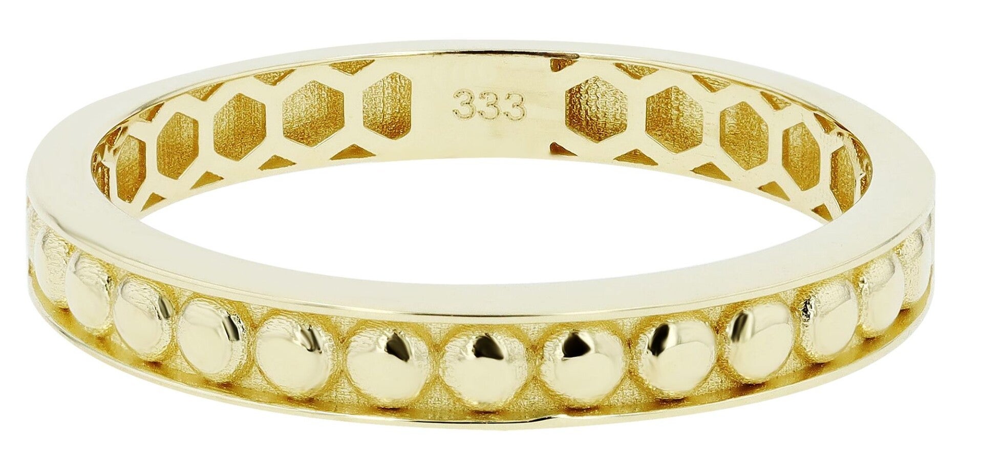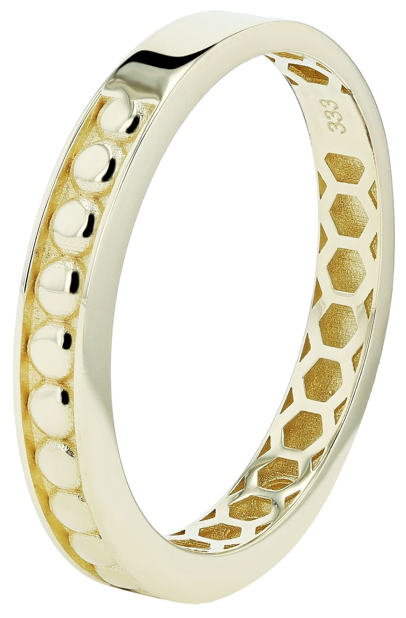 Der Damenring „Tammy“ aus hochwertigem 333er Gelbgold (8 Karat) überzeugt mit einem dezenten, aber ausdrucksstarken Design. Die polierte Oberfläche sorgt für einen edlen Glanz, während die runden Verzierungen dem Ring eine raffinierte Struktur verleihen und ihn zu einem stilvollen Blickfang machen.