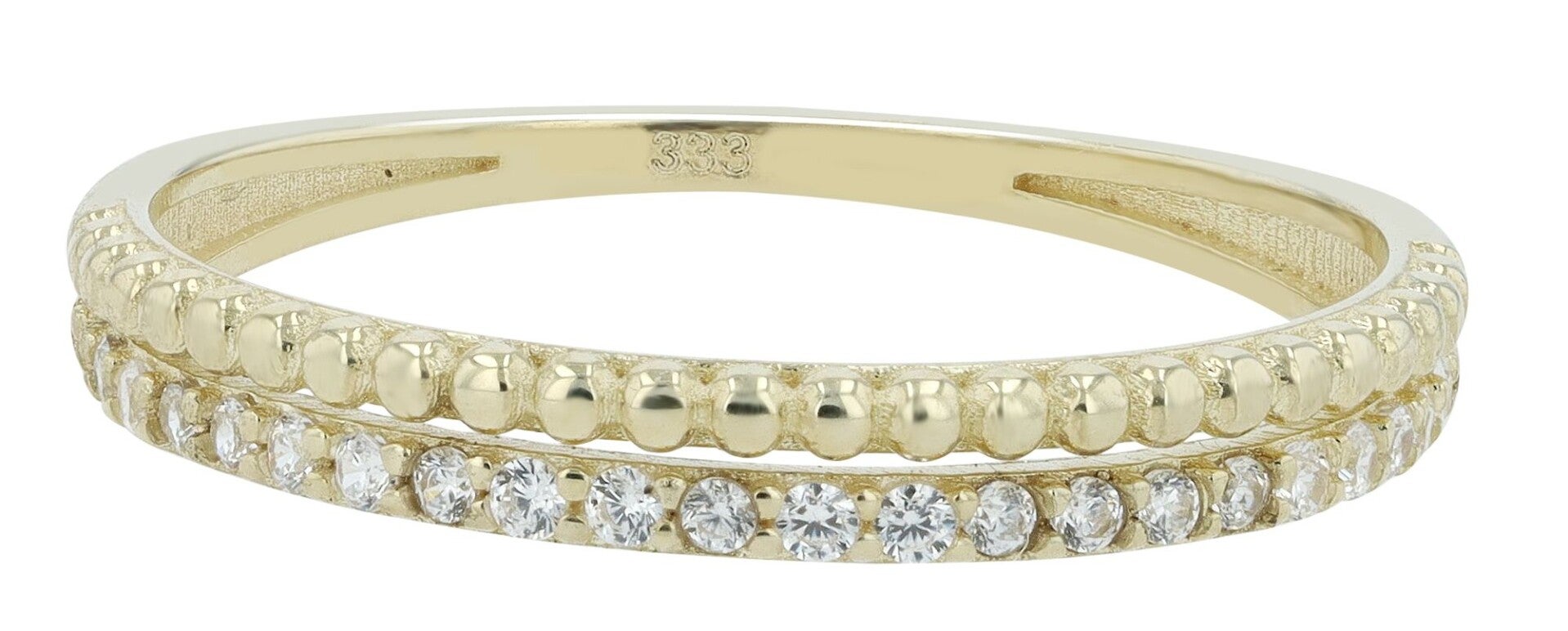 Der zweireihige Damenring „Spruce“ aus edlem 333er Gold (8 Karat) vereint filigranes Design mit raffinierter Detailverliebtheit. Eine Schiene ist mit 22 glanzvoll schimmernden Zirkonia besetzt, die bei jeder Bewegung das Licht reflektieren. Die zweite Schiene begeistert mit kugelförmigen Verzierungen, die dem Ring eine moderne, strukturierte Note verleihen.