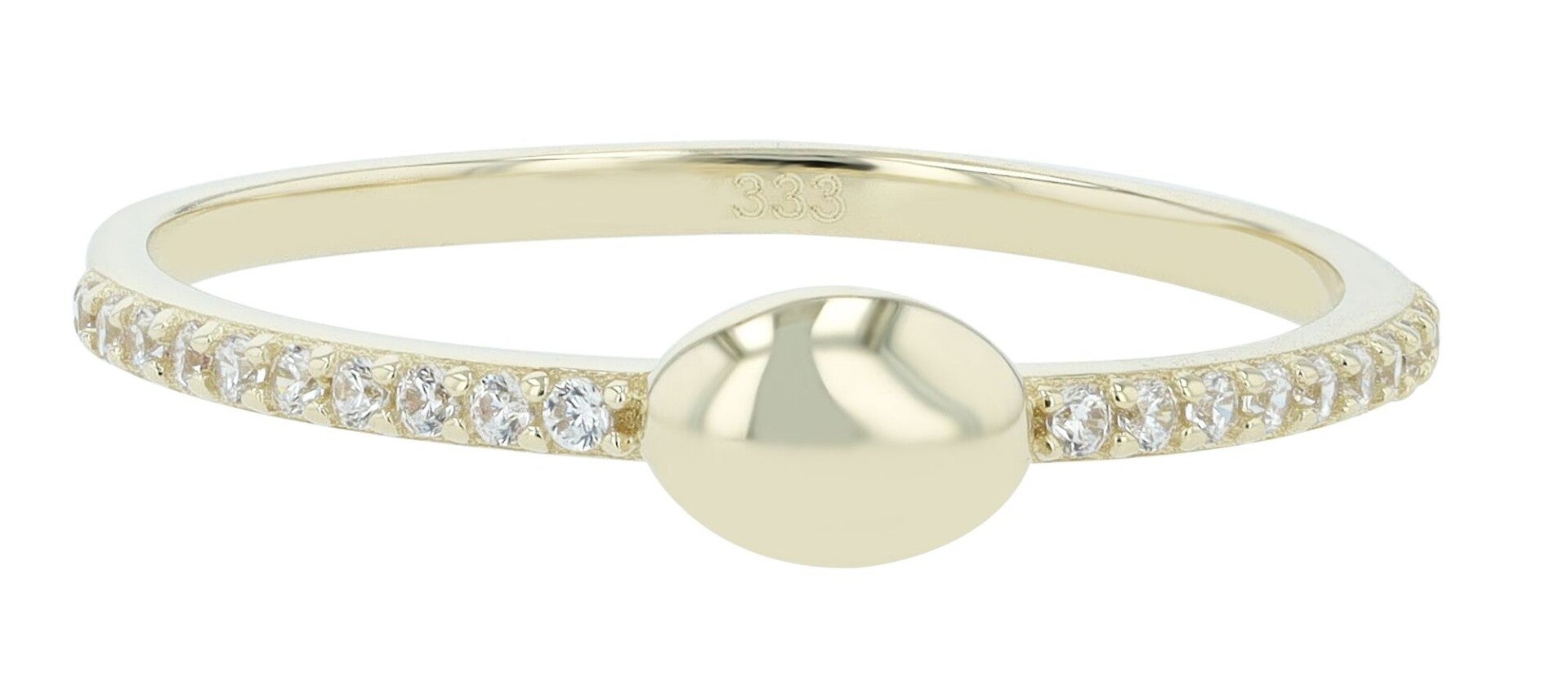 Der Damenring „Ares“ aus 333er Gold (8 Karat) vereint klassisches Design mit funkelnder Raffinesse. Im Mittelpunkt steht eine elegante ovale Verzierung aus Gelbgold, die von jeweils 10 weißen Zirkonia flankiert wird. Diese hochwertigen Schmucksteine fangen das Licht bei jeder Bewegung ein und setzen eindrucksvolle Akzente.
