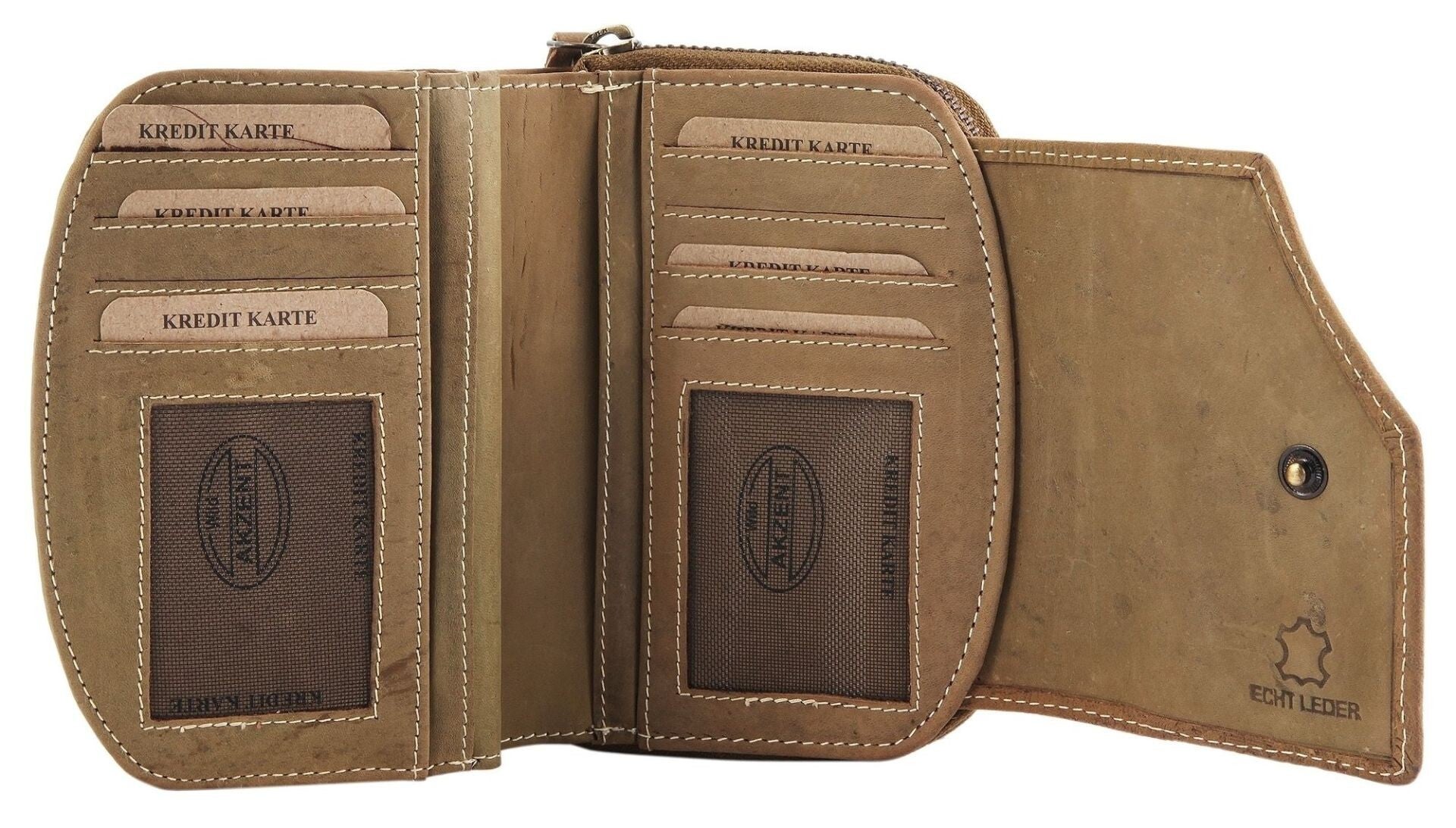 Im Inneren bietet die Geldbörse reichlich Stauraum: Mit 10 Kreditkartenfächern, 6 Einsteckfächern, 1 Ausweisfach, einem Münzfach mit Reißverschluss und einem zusätzlichen Reißverschlussfach im Inneren ist sie bestens organisiert. Der sichere Druckknopfverschluss rundet die durchdachte Ausstattung ab.