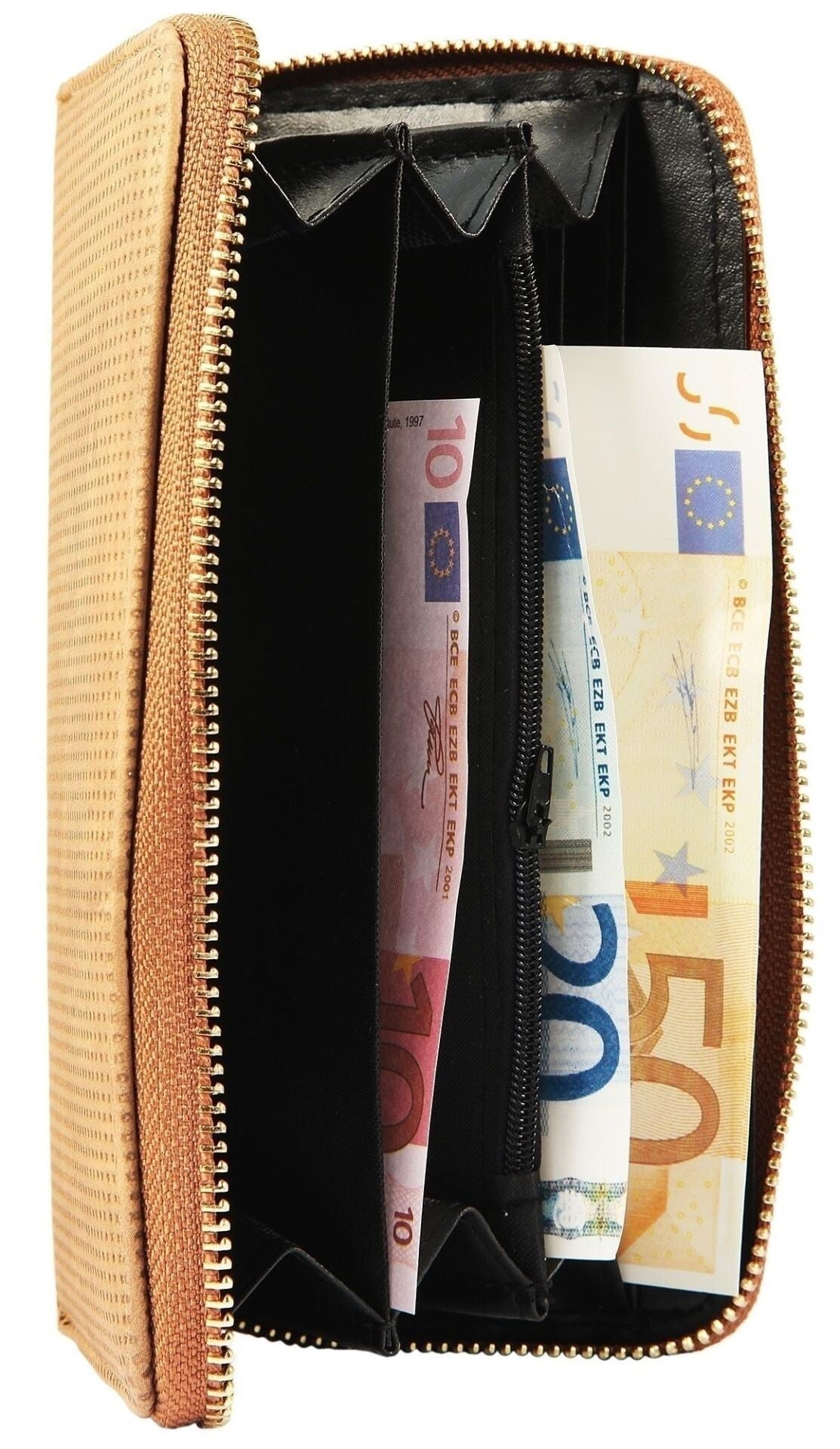 Im Inneren bietet sie 8 Kreditkartenfächer, 5 großzügige Geldscheinfächer und ein Münzgeldfach mit Reißverschluss, das sich sicher und bequem verschließen lässt. Trotz ihres großzügigen Stauraums bleibt die Geldbörse mit 19 x 10 x 3 cm angenehm handlich und passt in nahezu jede Handtasche.