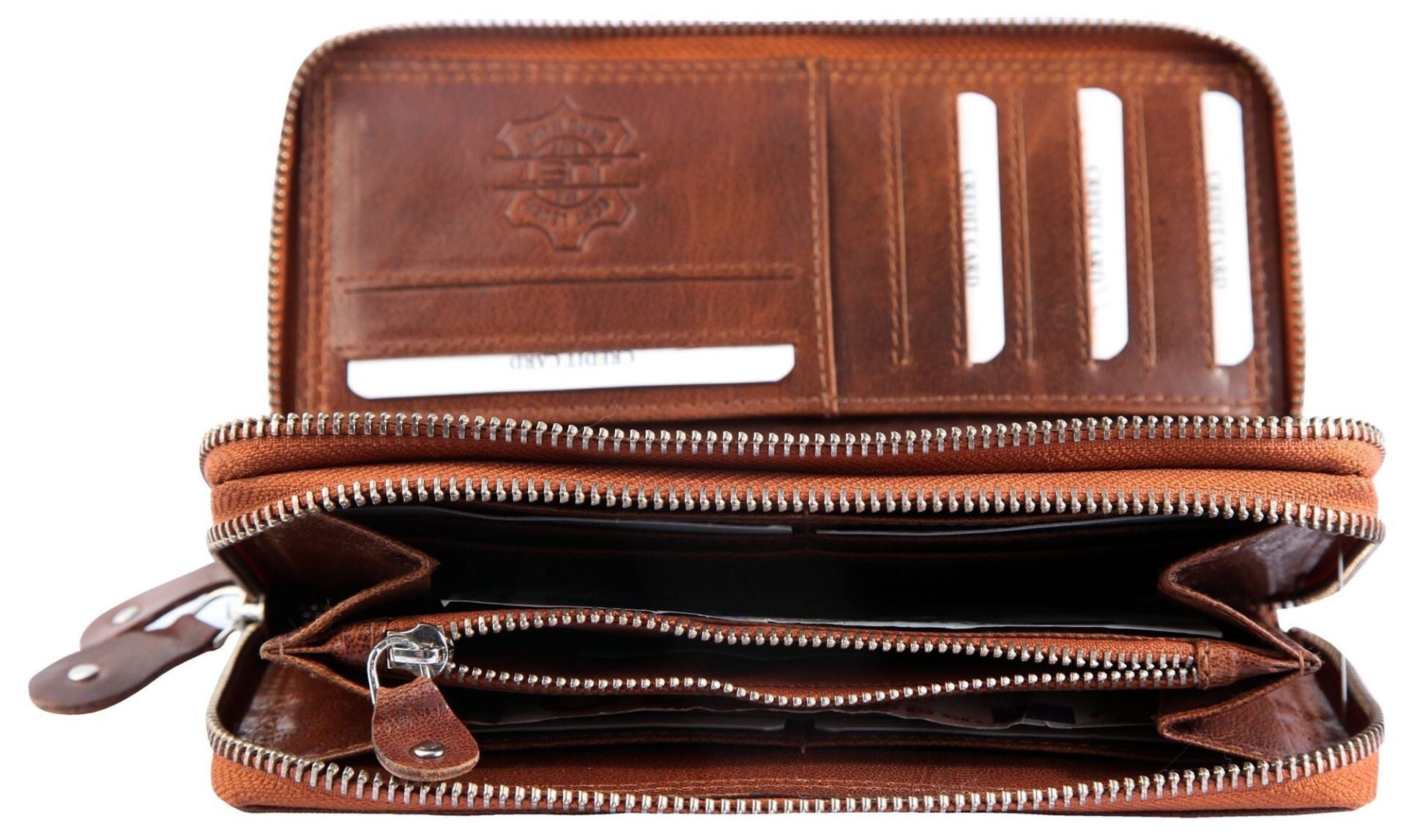 Fächer: 20 Kreditkartenfächer, 2 Geldscheinfächer, 1 Münzfach, 6 Einsteckfächer, 1 Ausweisfach