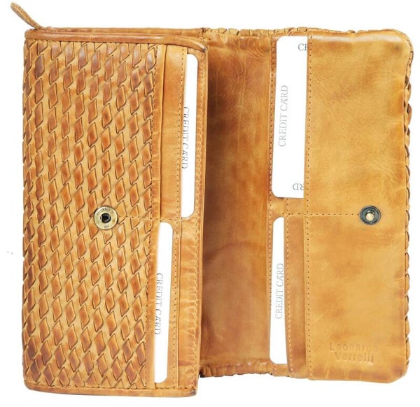#LeonardoVerrelli, #DamenGeldbörse, #Echtleder, #RFIDSchutz, #Camel, #WashedLook, #GewebtesLeder, #Modisch, #Portemonnaie, #Lederaccessoire