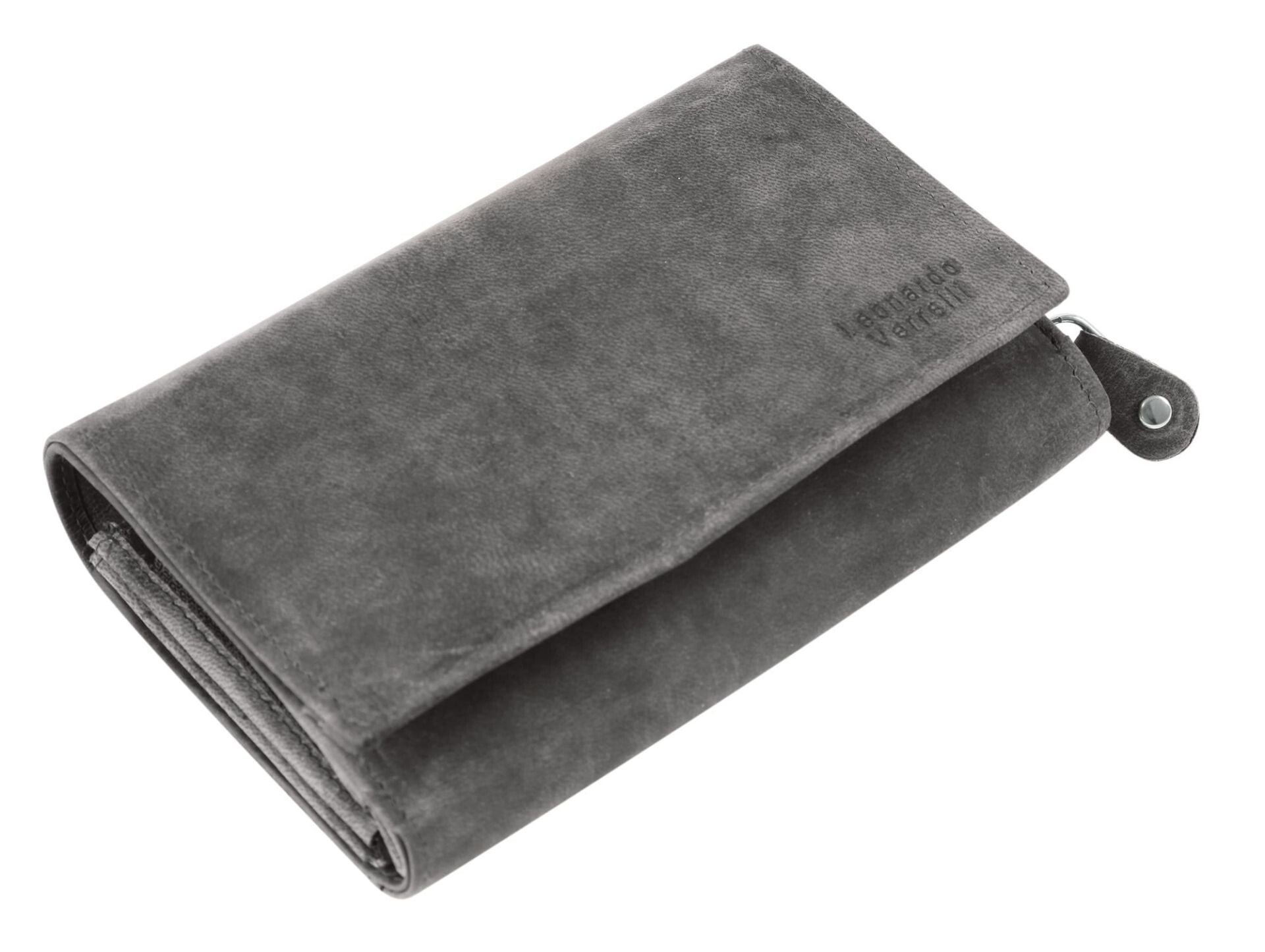 Die Leonardo Verrelli Damengeldbörse wurde im klassischen Querformat aus hochwertigem, echtem Ziegenleder gefertigt, das durch seine leicht angeraute Oberfläche eine edle und natürliche Optik erhält. Die sorgfältige Verarbeitung mit stabiler Naht im Außen- und Innenbereich garantiert eine lange Haltbarkeit und beste Qualität.