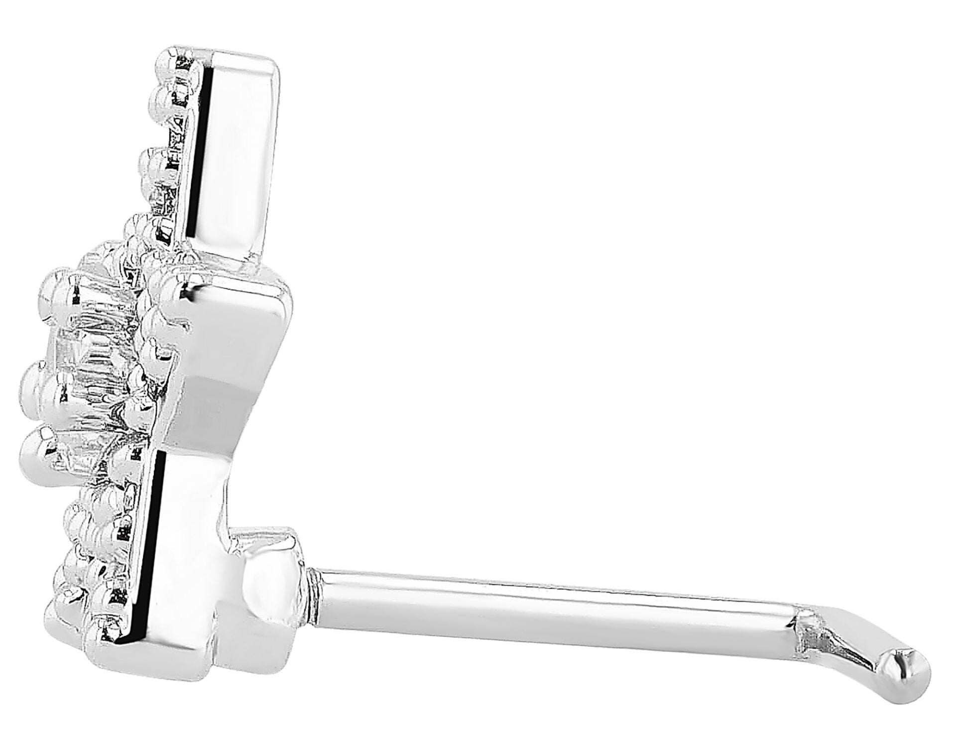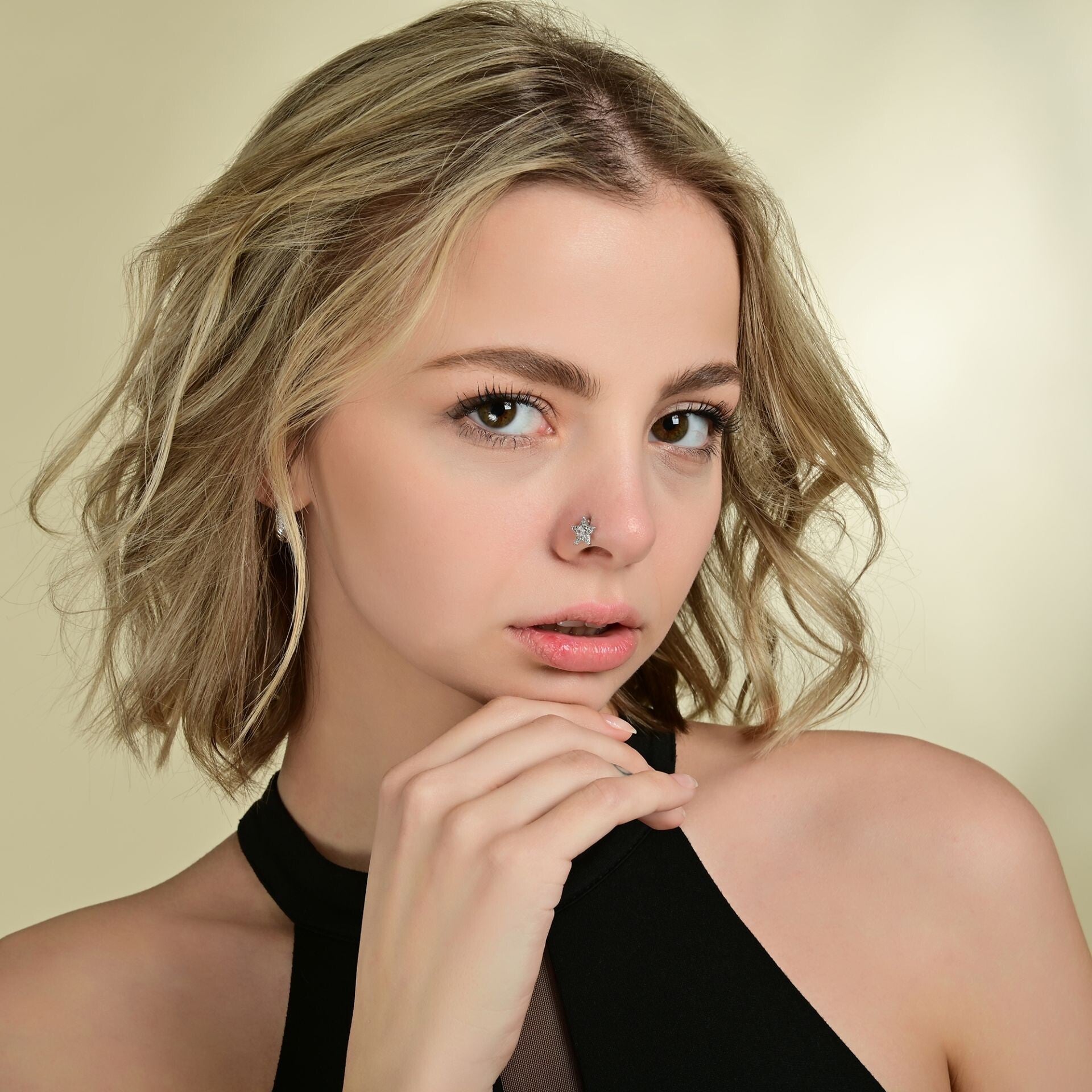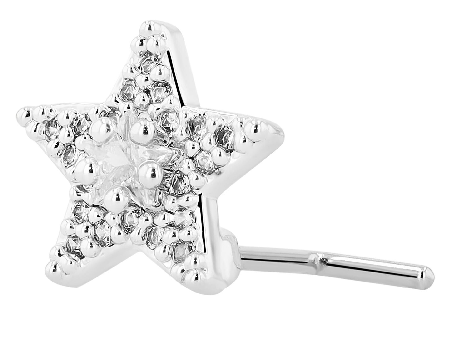 Die L-Form des Stabs sorgt für einen sicheren und angenehmen Halt, während die Stablänge von 7,5 mm und der Durchmesser von 0,9 mm eine komfortable Passform gewährleisten. Highlight des Designs ist der Sternförmige Stecker, der mit 21 funkelnden Zirkonia-Steinen besetzt ist. Mit einem Durchmesser von 0,9 cm und einer Höhe von 4 mm zieht das Schmuckstück alle Blicke auf sich – ob im Alltag oder zu besonderen Anlässen.