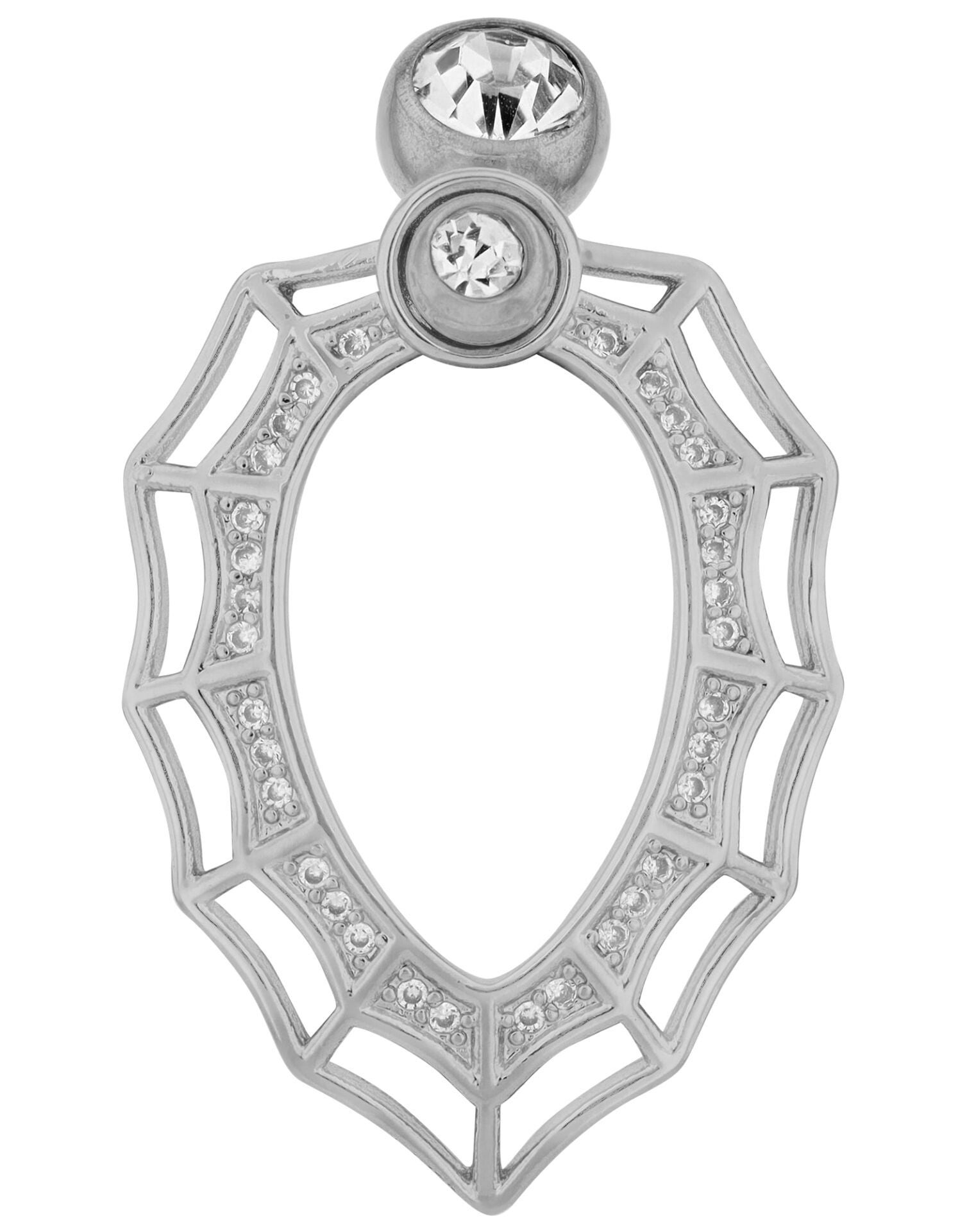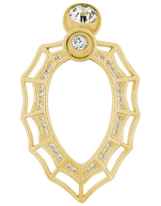 Beidseitig mit Zirkonia besetzt, glänzt das Piercing bereits am Stab. Das wahre Highlight ist jedoch der große bewegliche Anhänger, der mit 16 funkelnden Zirkonia verziert ist. Mit einer Größe von 34 mm x 23 mm sorgt dieses Element für stilvolle Eleganz bei jeder Bewegung. Die goldfarbene Oberfläche unterstreicht die luxuriöse Ausstrahlung dieses Accessoires.