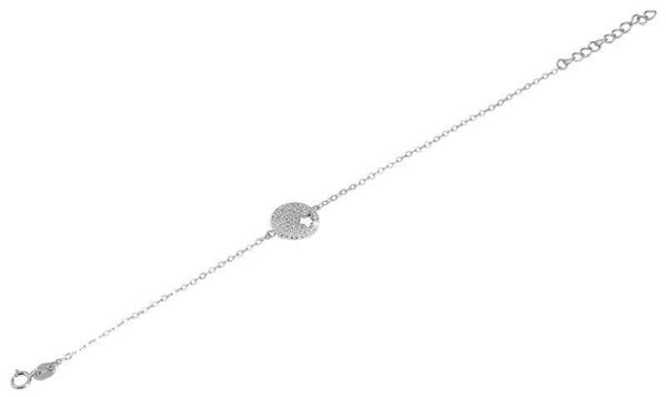 Der markante, runde Anhänger mit einem Durchmesser von 15 mm ist mit 68 funkelnden Zirkoniasteinen besetzt, die das silberfarbene Schmuckstück glanzvoll ergänzen und ihm eine modische, verspielte Note verleihen. Das Armband wird sicher mit einem Karabinerverschluss geschlossen und eignet sich ideal als stilvolles Accessoire für den Alltag oder besondere Anlässe.