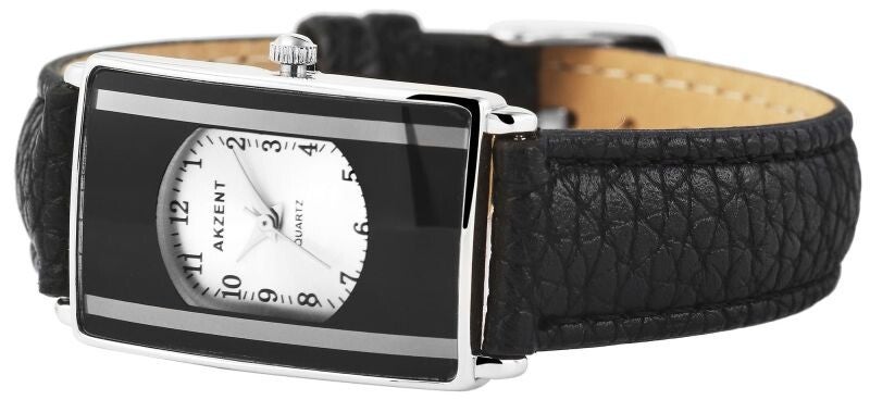 Die Akzent Damenuhr mit Lederimitationsarmband überzeugt durch ihr zeitlos elegantes Design und hochwertige Verarbeitung. Das schmale, 16 mm breite schwarze Lederimitatband bietet angenehmen Tragekomfort und wird mit einer klassischen Dornschließe sicher geschlossen. Das silberfarbene Metallgehäuse mit den Maßen 23 x 34 mm präsentiert sich schlank und feminin.