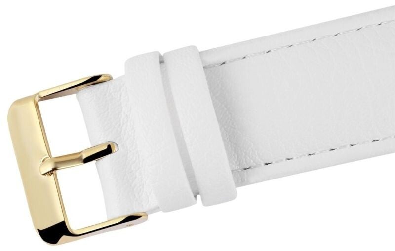 Die King Star Damenuhr kombiniert zeitlose Eleganz mit edlen Details. Das weiße Lederimitatarmband mit 21 mm Breite und klassischer Dornschließe sorgt für hohen Tragekomfort und sicheren Halt.