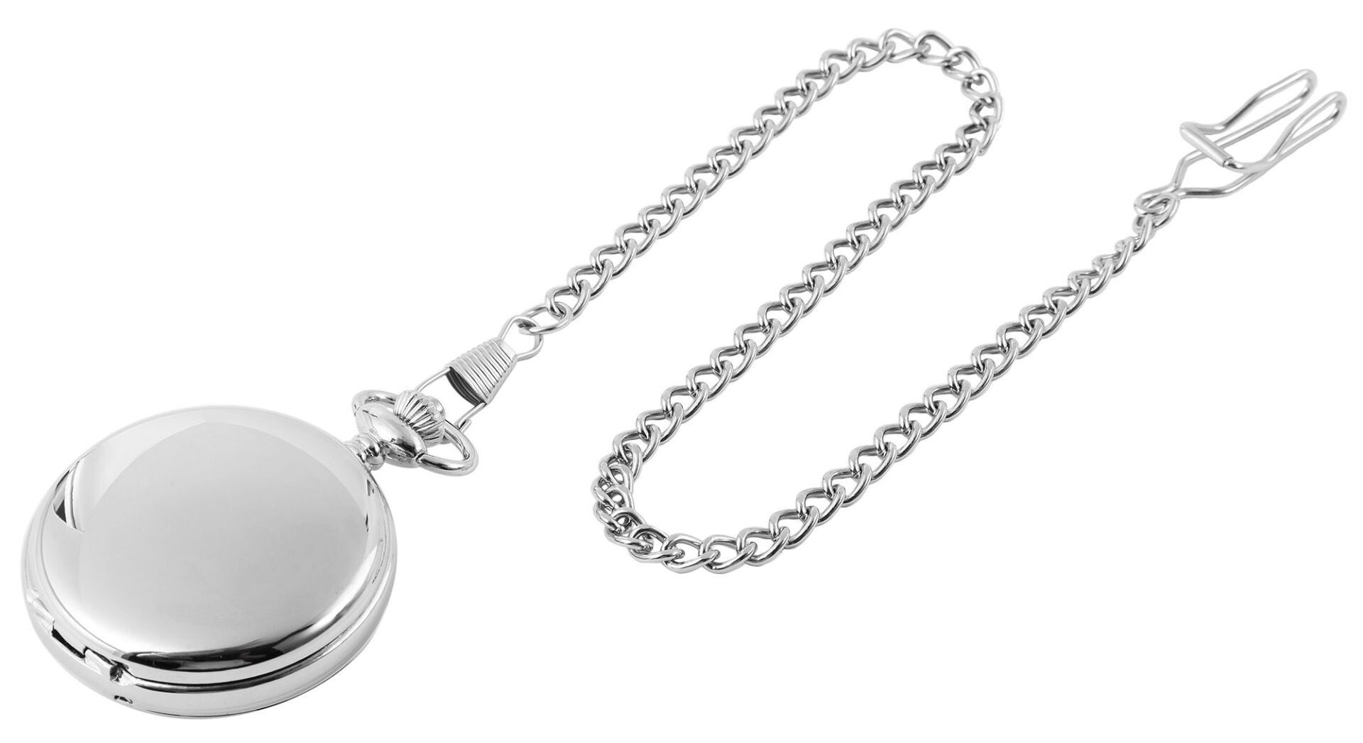 Ein stilvolles Highlight ist die ca. 36 cm lange, farblich abgestimmte Uhrenkette mit praktischem Karabinerhaken, die sicheren Halt und klassischen Look verbindet. Mit 47 mm Durchmesser und 16 mm Gehäusehöhe ist diese Taschenuhr ein markanter Zeitmesser, der sich zudem durch Gravuren personalisieren lässt – perfekt als Geschenk für Uhrenliebhaber und Sammler.