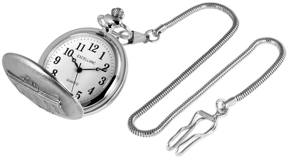 Die Excellanc Taschenuhr vereint klassisches Design mit einem besonderen Blickfang. Das silberfarbene Metallgehäuse ist auf der Rückseite mit einem floralen Muster verziert, während die Vorderseite das ikonische Brandenburger Tor in goldfarbener Ausführung zeigt. Dieses detailreiche Motiv macht die Uhr zu einem einzigartigen Accessoire und einem stilvollen Statement.