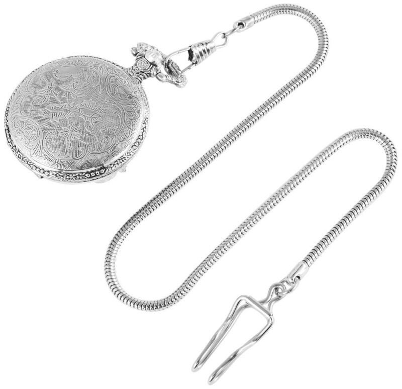 Die Taschenuhr lässt sich bequem über den in die Krone integrierten Druckknopf öffnen. Eine 30 cm lange silberfarbene Taschenuhrkette im Schlangenmuster sorgt für sicheren Halt an Tasche oder Kleidung. Mit einem Durchmesser von 47 mm und einer Höhe von 16 mm ist diese Taschenuhr ein stilvolles Accessoire für Freizeit, Motorradfans und Liebhaber klassischer Uhren.
