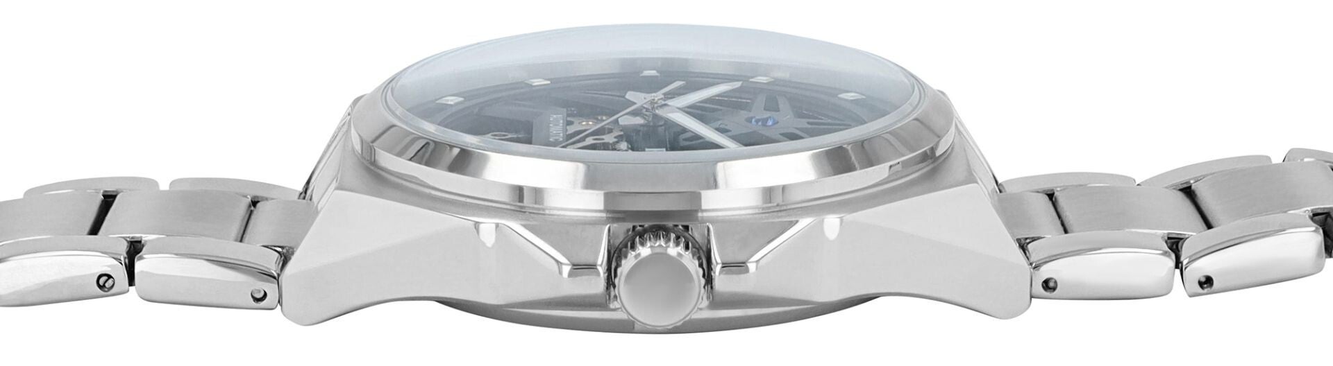 Das massive achtkantige Edelstahlgehäuse mit runder Lünette (Ø 47 mm x 15 mm) verleiht der Uhr Charakter und Präsenz. Geschützt wird das Werk durch robustes Mineralglas, während das edle Gliederarmband aus gebürstetem und poliertem Edelstahl (22 mm Breite, 21 cm Gesamtlänge) mit sicherer Faltschließe höchsten Tragekomfort garantiert. Mit einer Wasserdichtigkeit von 5 ATM ist diese Uhr auch für den Alltag bestens gerüstet.