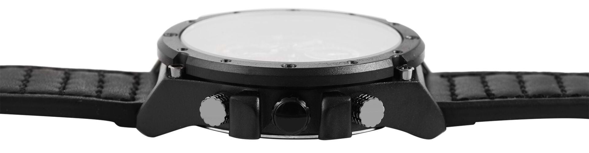 Der Elite Herren Chronograph vereint markantes Design mit praktischer Funktionalität. Das schwarze Echtlederarmband mit roten Steppnähten unterstreicht den sportlichen Charakter dieser Uhr, während die roten Zeiger und Indexe auf dem schwarzen Zifferblatt für stilvolle Akzente sorgen. Mit einem Durchmesser von 50 mm und einer Höhe von 14 mm setzt das massive Metallgehäuse ein starkes Statement am Handgelenk.